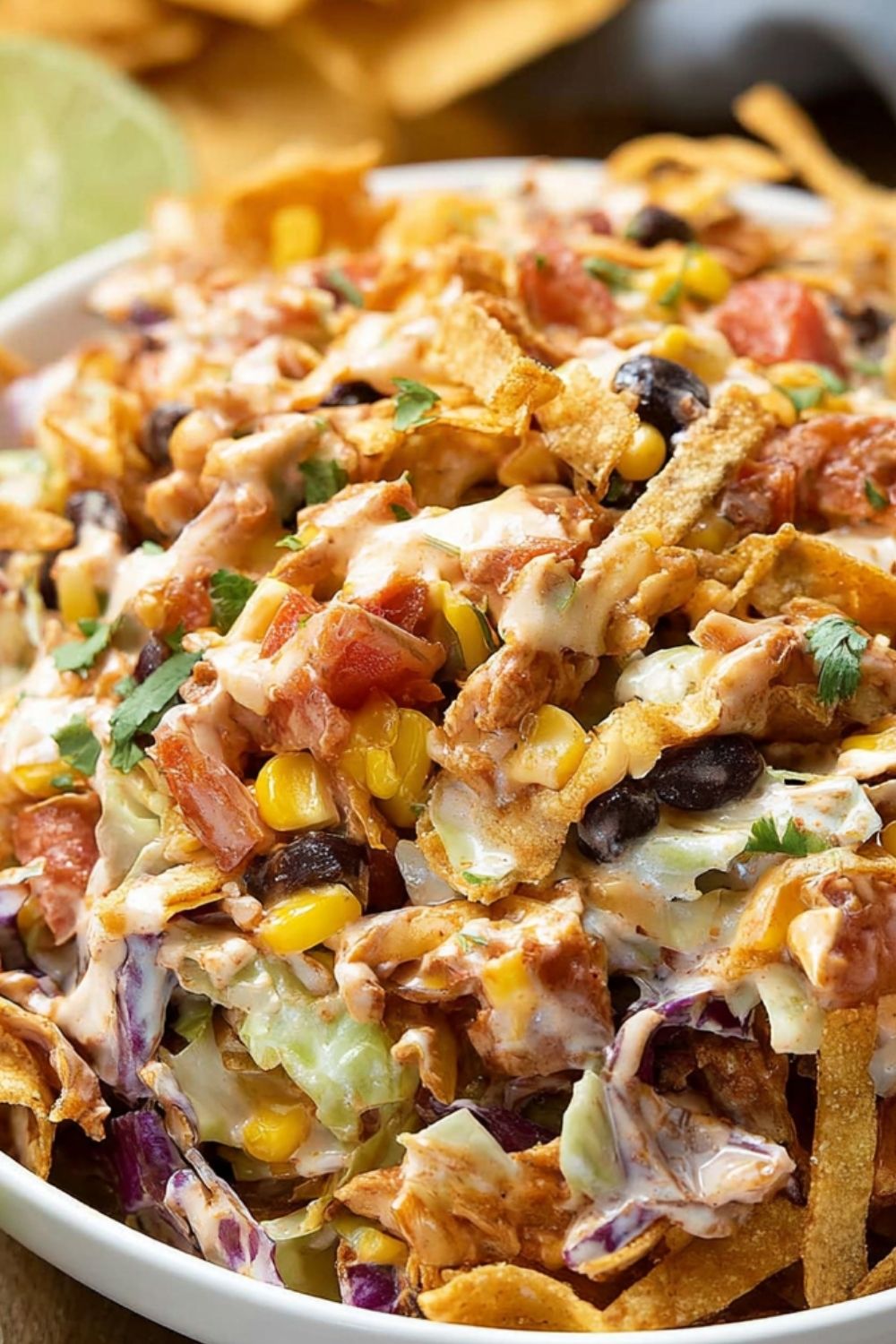 Fritos (corn chips) – Crushed over the top for that signature crunch and salty contrast.