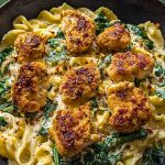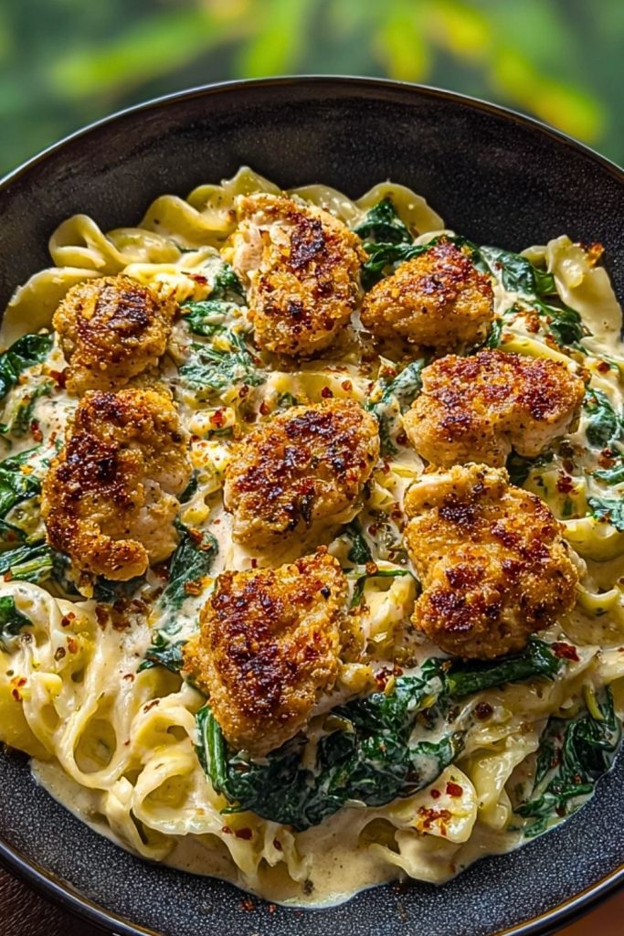 A rich and satisfying pasta dish featuring golden garlic chicken bites served atop fettuccine coated in a creamy Cajun Alfredo sauce with tender spinach and tangy artichoke hearts. This restaurant-style comfort meal blends bold flavor with creamy indulgence and crispy texture for a stunning, crowd-pleasing dinner.