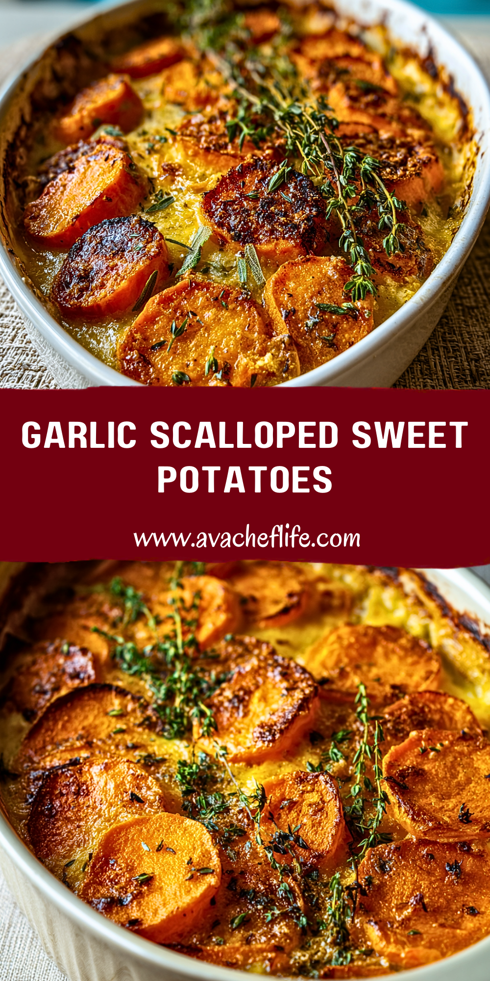 Keywords: garlic scalloped sweet potatoes, holiday side dish, easy potato bake, gluten-free recipe