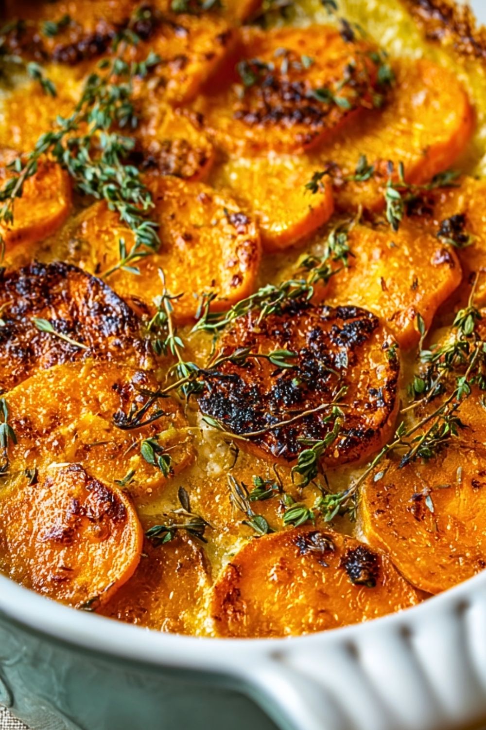 Golden, caramelized edges with a tender, creamy center—these Garlic Scalloped Sweet Potatoes are a comforting, elegant twist on a classic. Thinly sliced sweet potatoes are layered with a savory garlic cream sauce, baked to bubbling perfection, and finished with a subtle touch of fresh herbs. Each bite strikes a perfect balance between sweetness and umami, creating a dish that feels indulgent yet wholesome.