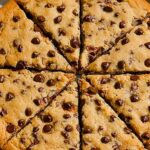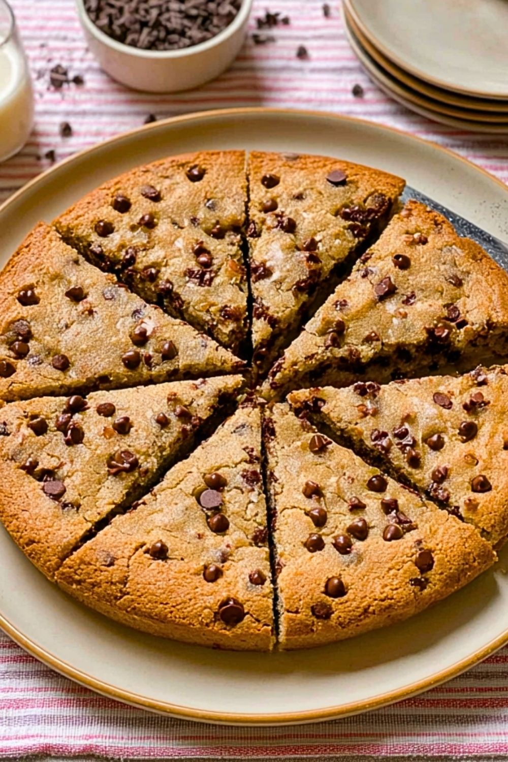 Use room temperature ingredients — especially the butter and egg — to help everything combine smoothly. Cream the butter and sugars for at least 2–3 minutes to build volume and fluffiness in the dough. Don’t overmix once you add the dry ingredients; overworking the dough can lead to a tough cookie. Press extra chocolate chips on top of the dough before baking for a picture-perfect finish. And always allow the cookie to cool in the pan for at least 10–15 minutes before slicing — it sets as it cools and becomes easier to cut without crumbling.