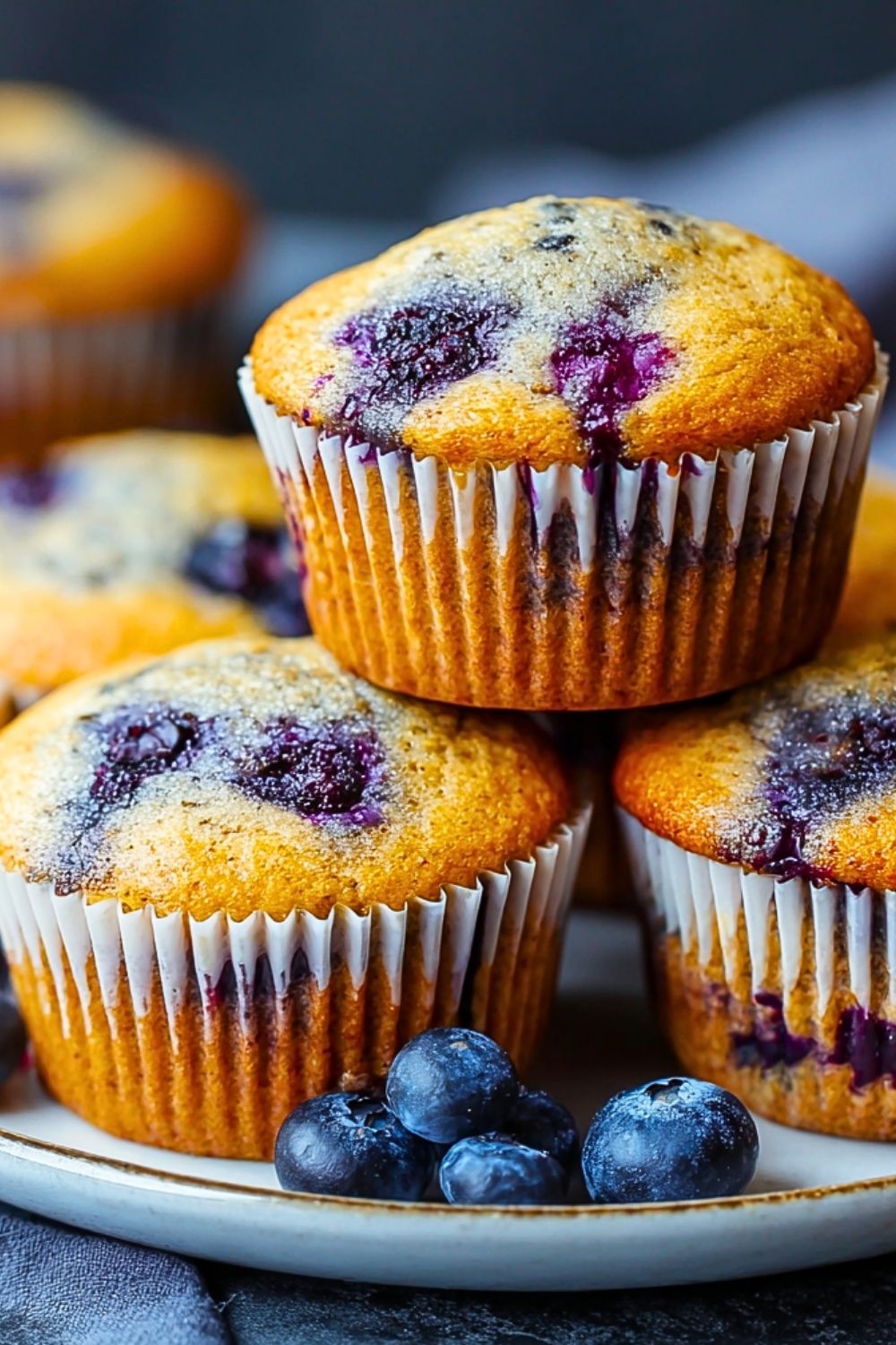 Make sure to use a good quality gluten-free all-purpose flour blend that includes xanthan gum — it mimics gluten’s structure, giving the muffins that signature soft and tender bite. If your flour doesn’t contain xanthan gum, add ½ teaspoon per cup of flour. For plump, juicy blueberries throughout, toss them lightly in a spoonful of flour before folding them into the batter — this keeps them from sinking to the bottom. Avoid overmixing once the wet and dry ingredients are combined; gentle mixing ensures a light, airy texture. Lastly, let the batter rest for 5–10 minutes before baking. This allows the flour to hydrate fully and results in taller muffins.