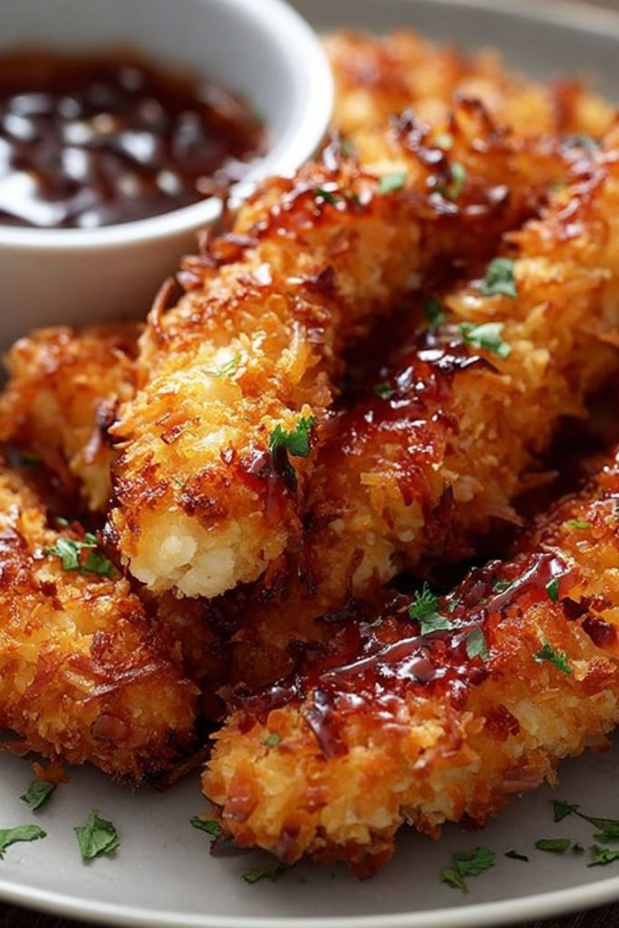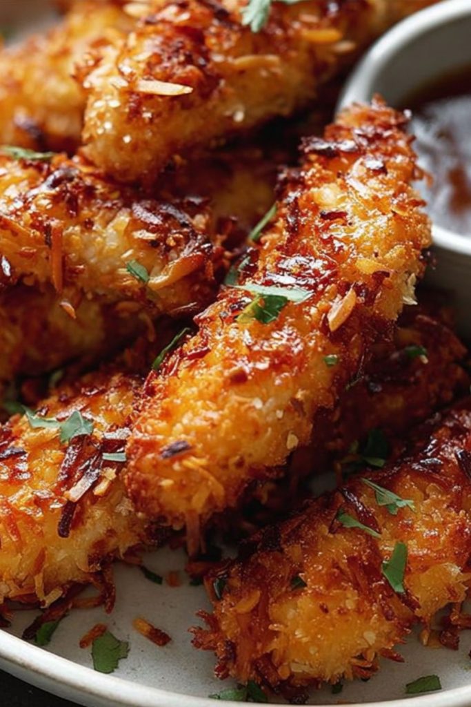 Keywords: coconut chicken, crispy chicken strips, quick dinner, easy recipe, healthy snack, food ideas