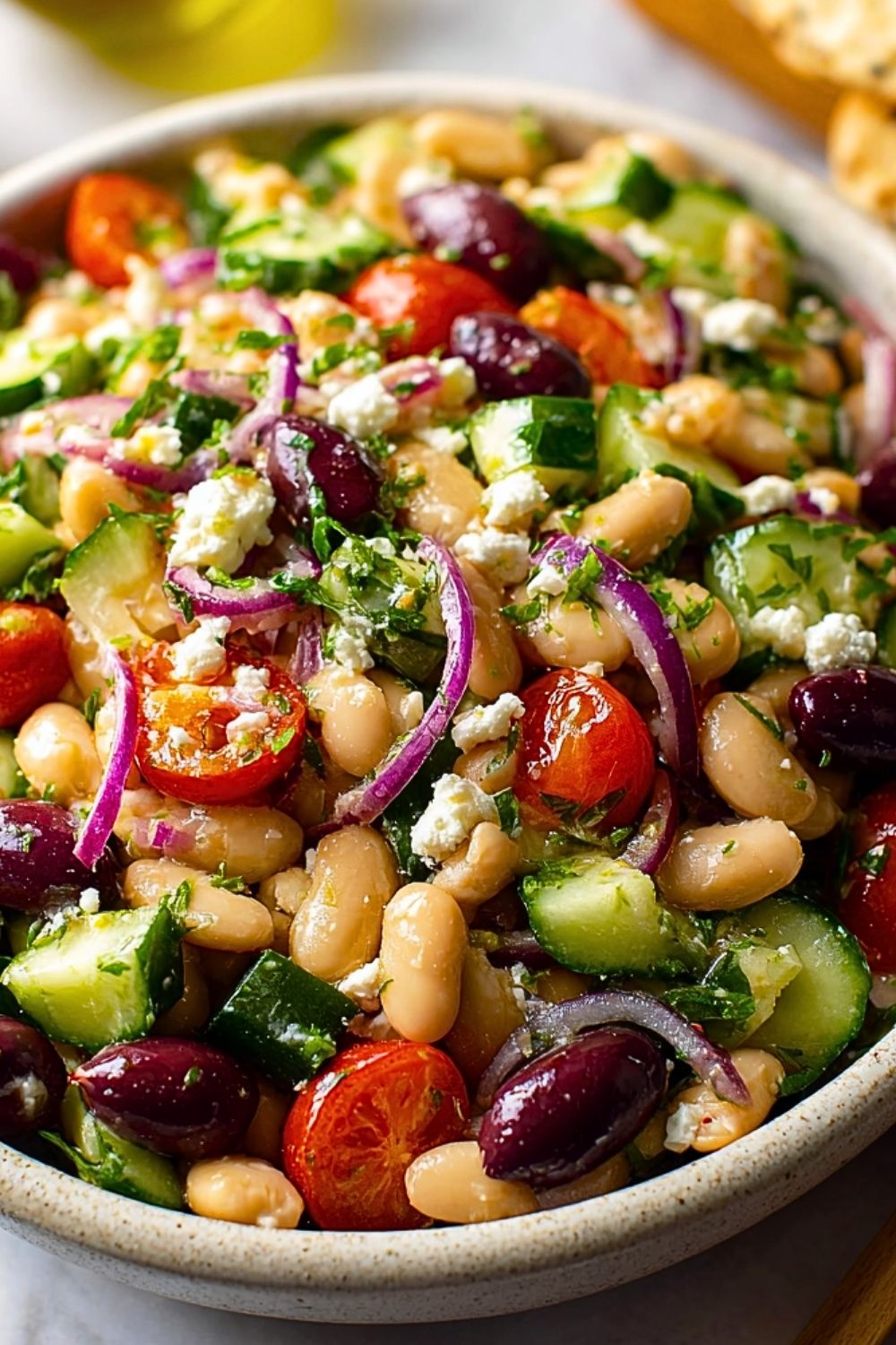 What makes this salad extra special is the way the white beans soak up all the citrusy, garlicky flavors from the marinade. Combine that with crisp cucumbers, juicy cherry tomatoes, briny olives, and creamy feta, and every bite feels like a little trip to the Mediterranean. It’s colorful, crunchy, and full of bold flavor—my kind of simple, wholesome food.