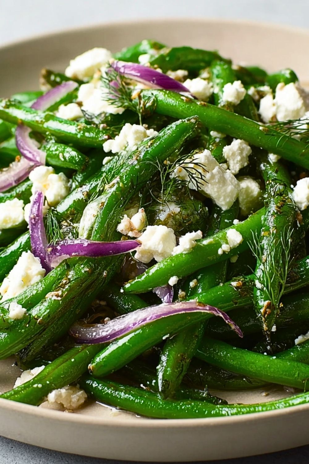 Make Ahead: You can prepare all components separately a day in advance. Blanch and chill the green beans, slice the onions, crumble the feta, and mix the dressing. Toss everything together just before serving.