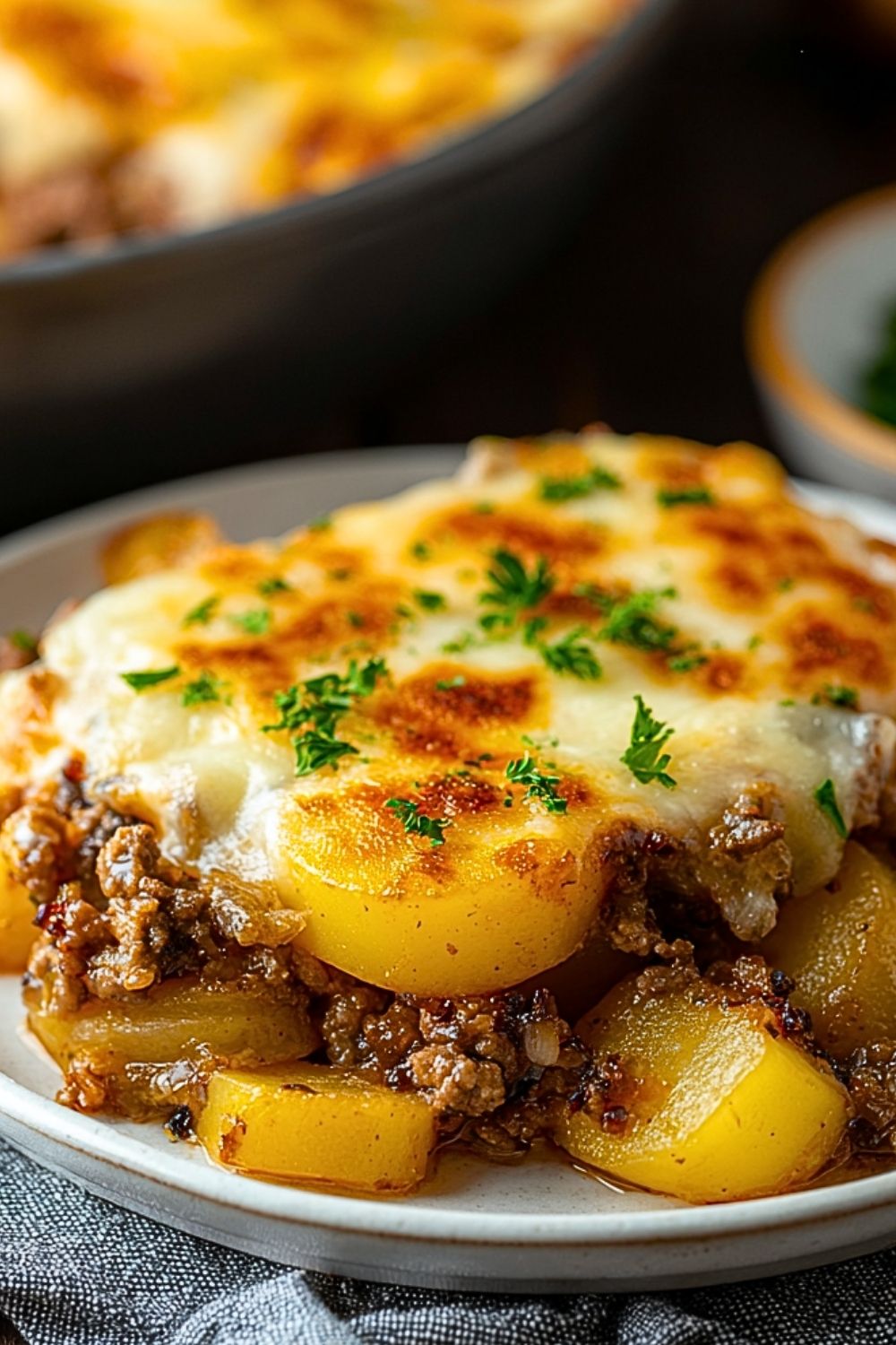 With minimal prep and simple ingredients, it transforms pantry staples into a cozy masterpiece. The layers of thinly sliced potatoes soak up the rich beef and onion mixture, while the cheesy top provides the perfect finishing touch. This is comfort food at its best—easy to make, hard to resist, and even better the next day.