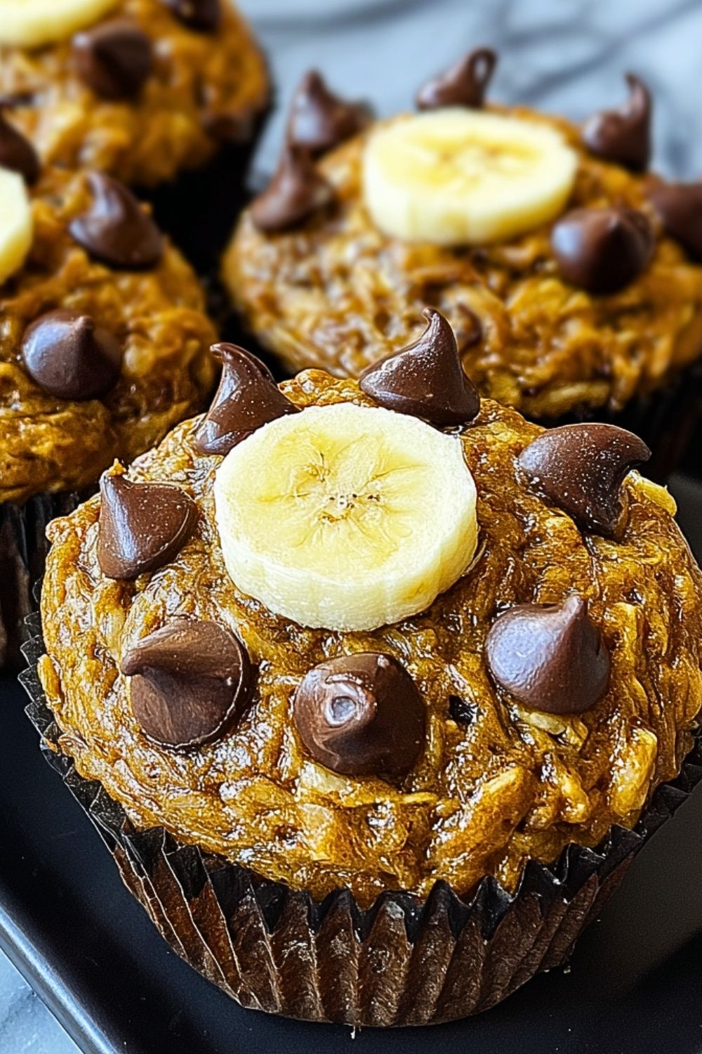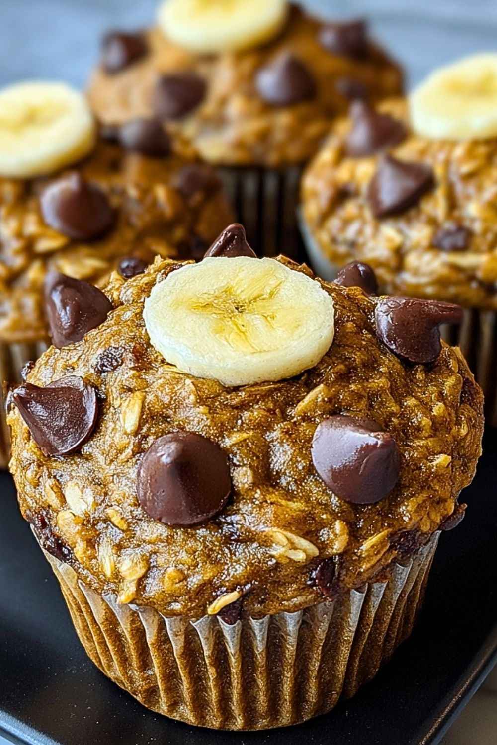 Scoop the batter evenly into the prepared muffin tin, filling each cup about 3/4 full. Top with the remaining chocolate chips and banana slices if desired.