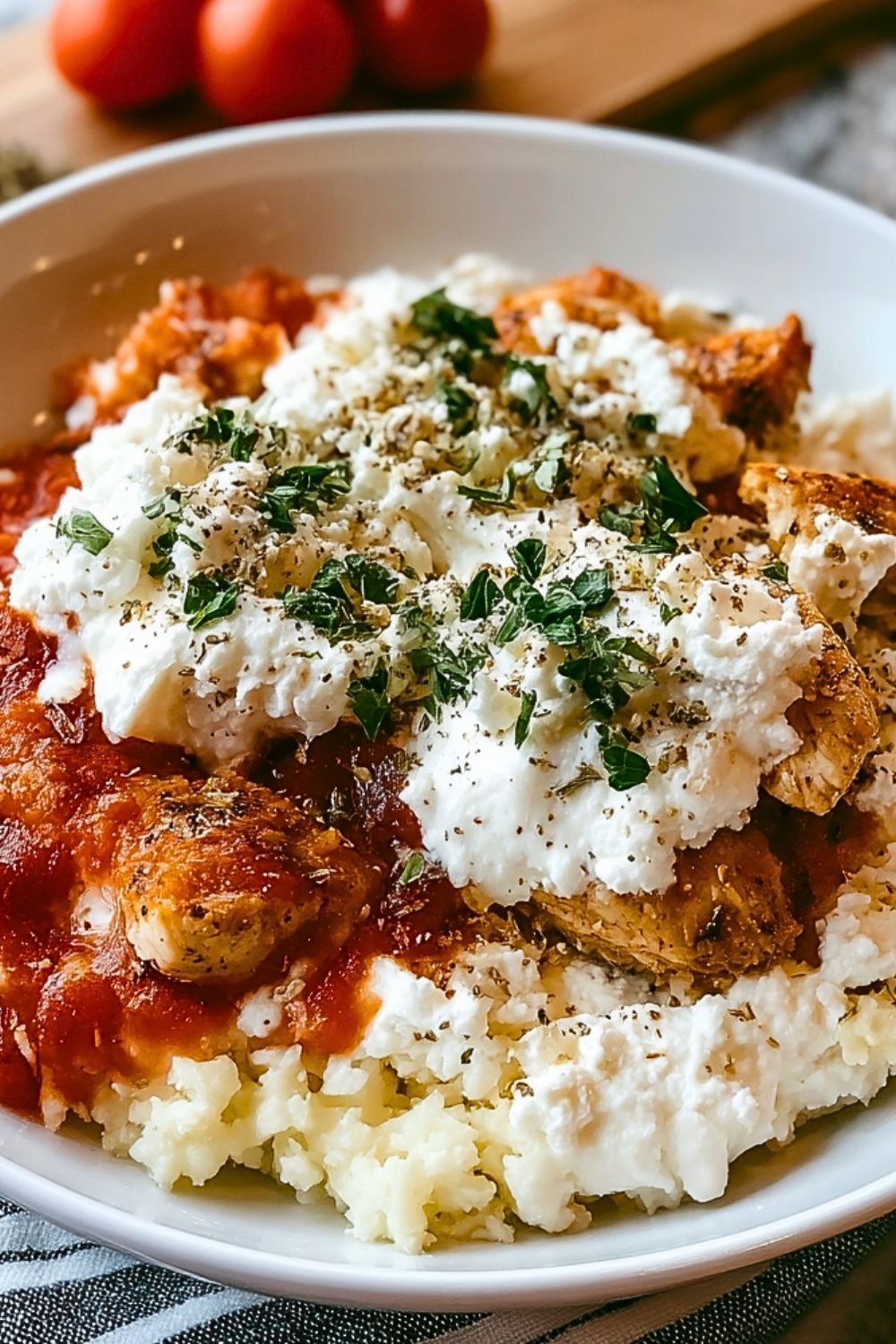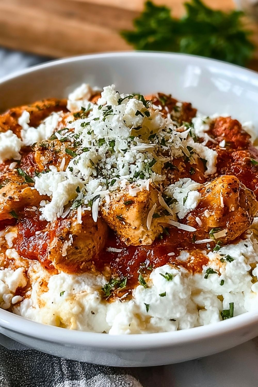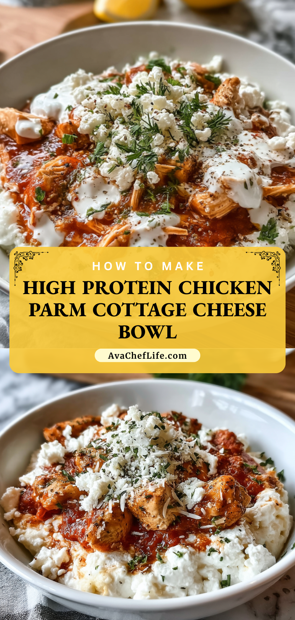 Keywords: high protein chicken parm cottage cheese bowl, easy dinner, healthy snack, meal prep, chicken parmesan bowl, cottage cheese recipe, high protein meal, food ideas, dinner ideas