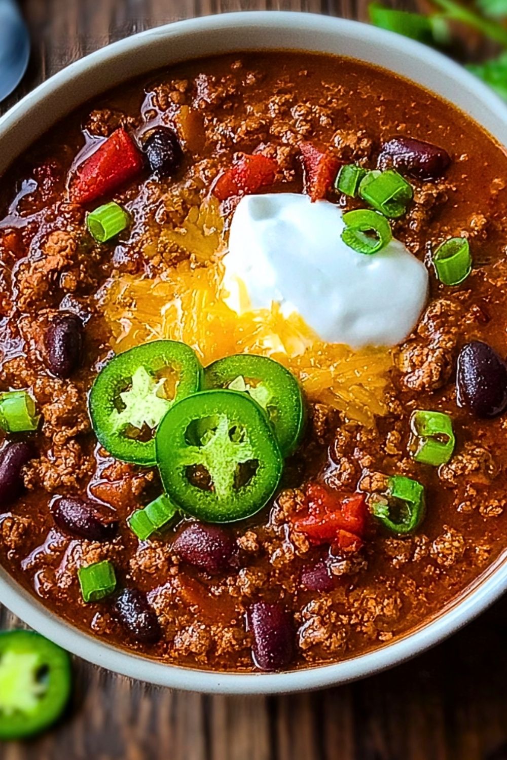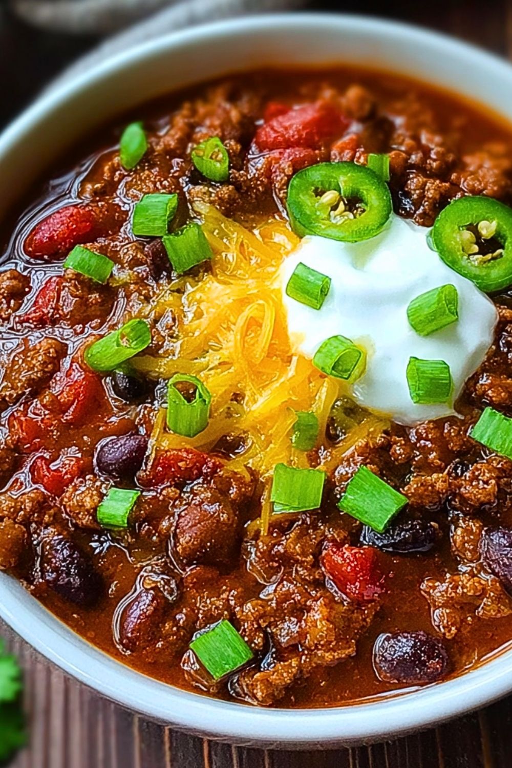 Ladle the hot chili into bowls and top with your favorite extras—shredded cheese, a dollop of Greek yogurt, chopped green onions, or fresh cilantro. Enjoy warm!