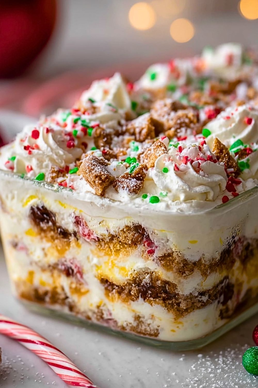 Perfect for holiday gatherings, cookie swaps, or cozy family nights, this layered dessert transforms classic Christmas cookies into something spectacular. Served chilled and topped with whipped swirls and crushed peppermint, it’s a centerpiece-worthy creation that’s surprisingly simple to prepare.