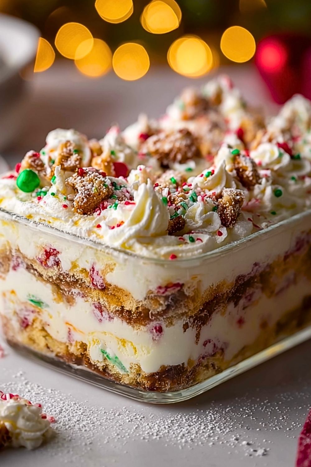 Homemade Christmas Cookie Lasagna is a festive, no-bake dessert that captures the magic of the holidays in every creamy, layered bite. With soft cookie crumbles, luscious cream filling, and a generous sprinkle of red and green candy pieces, this show-stopping treat looks as joyful as it tastes. Each layer brings a blend of sweetness and texture, creating a dessert that feels both nostalgic and irresistibly indulgent.