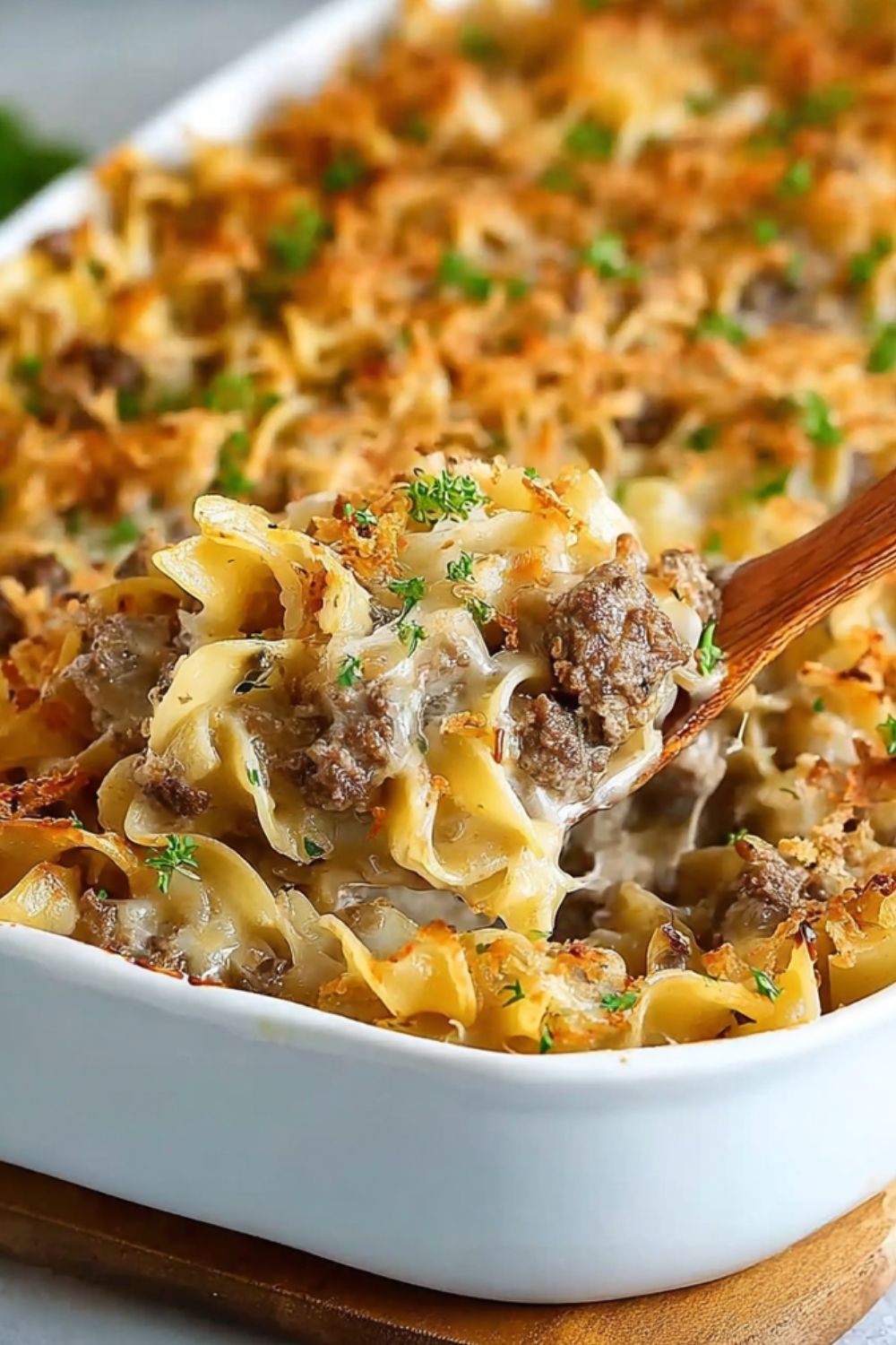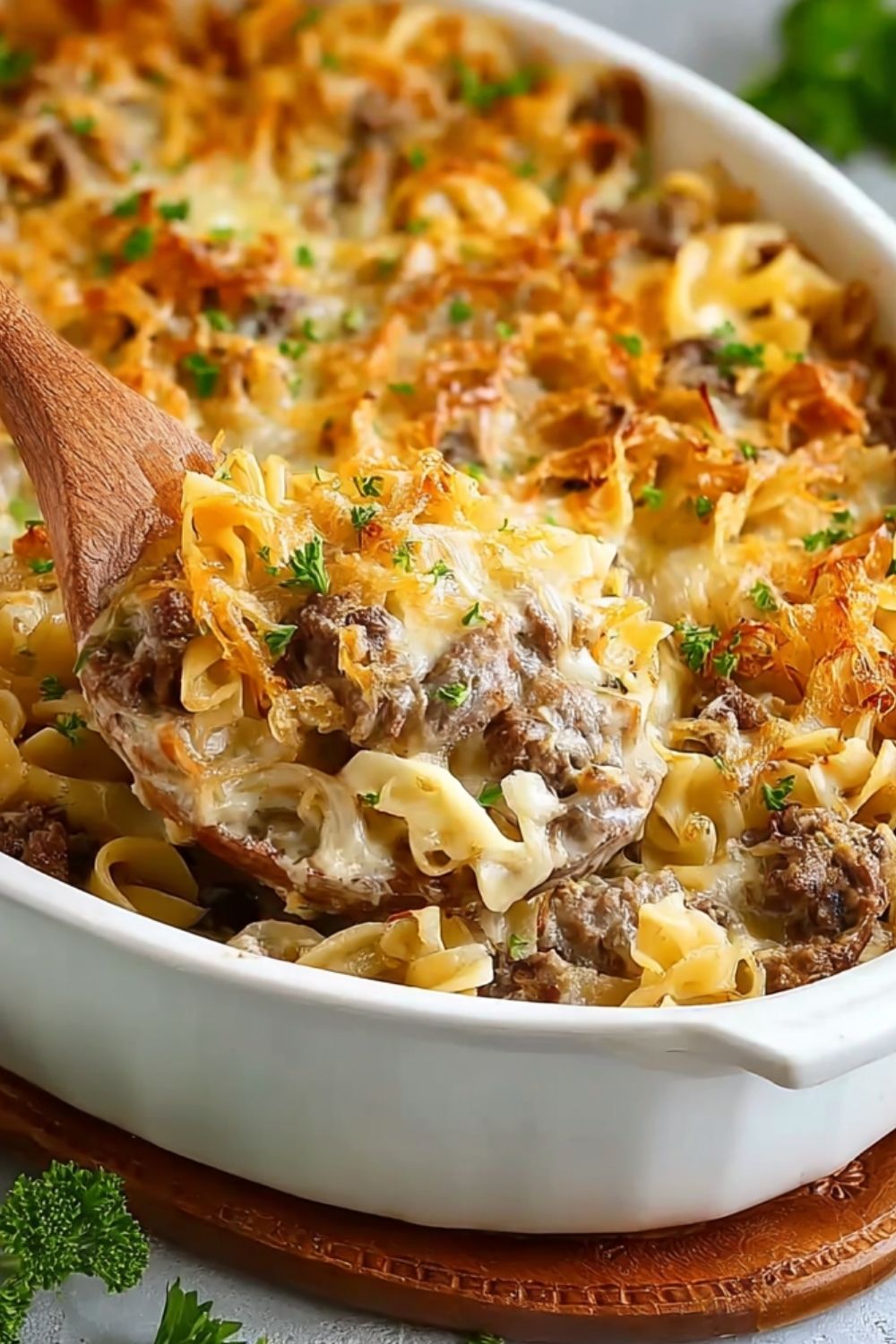 Golden, cheesy, and bubbling with flavor, this Homemade French Onion Beef Casserole is a comforting classic that brings the heartiness of ground beef, the richness of caramelized onions, and the creaminess of a savory sauce all in one dish. With crispy fried onions layered on top and tender egg noodles holding everything together, it’s a warm, welcoming meal that’s as easy to whip up as it is to fall in love with.