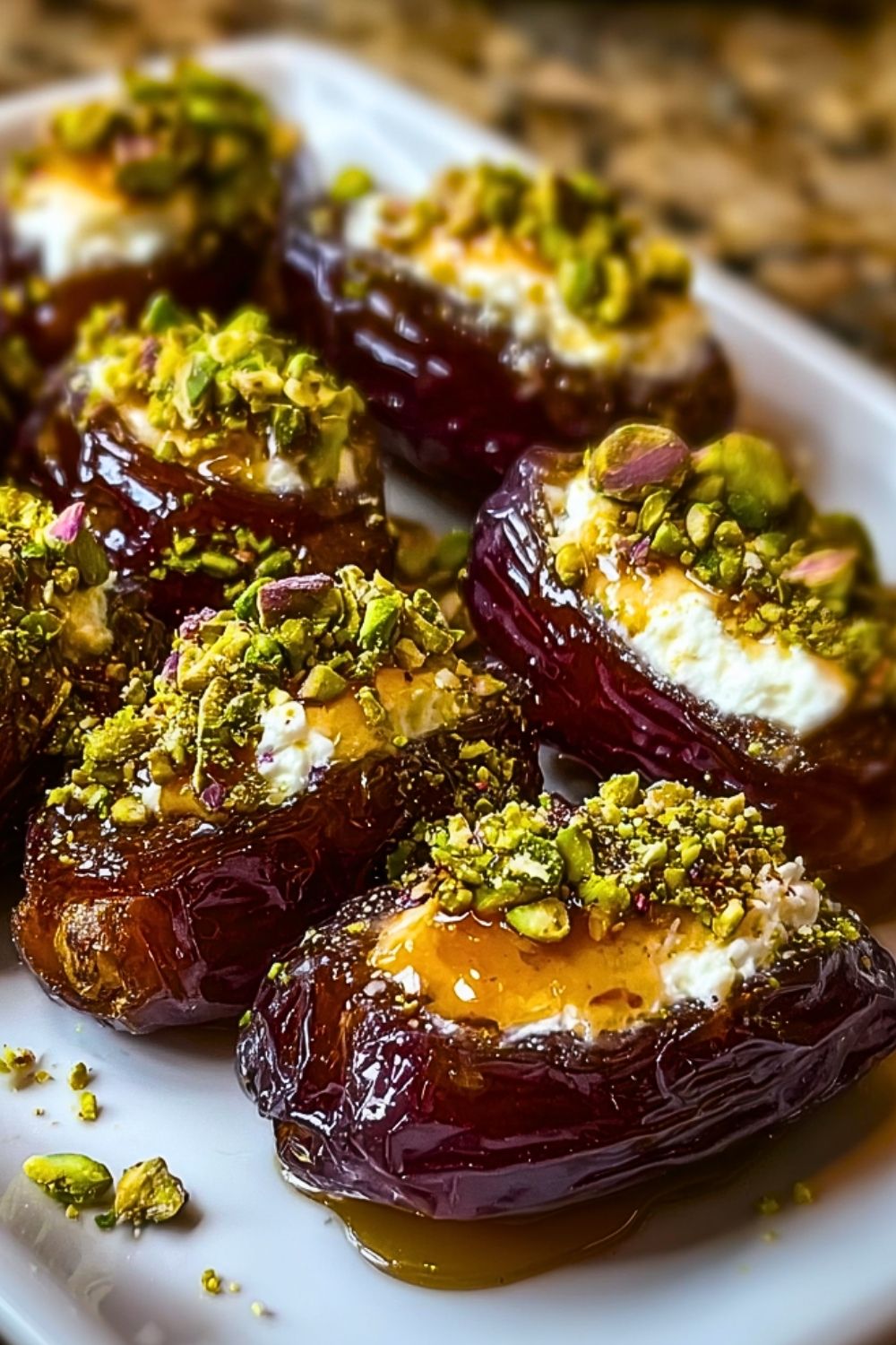 Arrange the stuffed dates on a serving platter. For a professional look, space them evenly and finish with an extra sprinkle of pistachios and a final drizzle of honey right before serving.