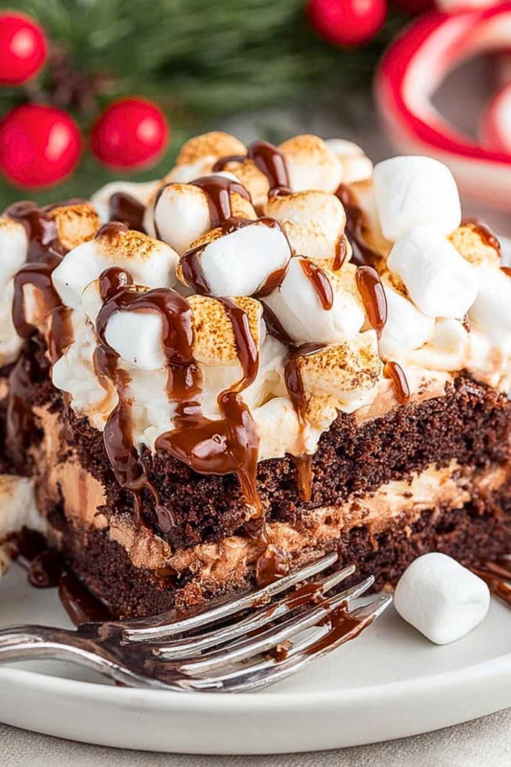 For best results, let the cake rest in the refrigerator overnight to intensify the flavor and improve its texture. If using marshmallow creme, warming it slightly makes it much easier to spread without tearing the cake. The hot fudge sauce should be warm but not too runny; a thick pour helps it stay inside the poked holes instead of pooling on top. You can easily customize the toppings with holiday-themed candies, nuts, or even crushed graham crackers for a s’mores-inspired version.