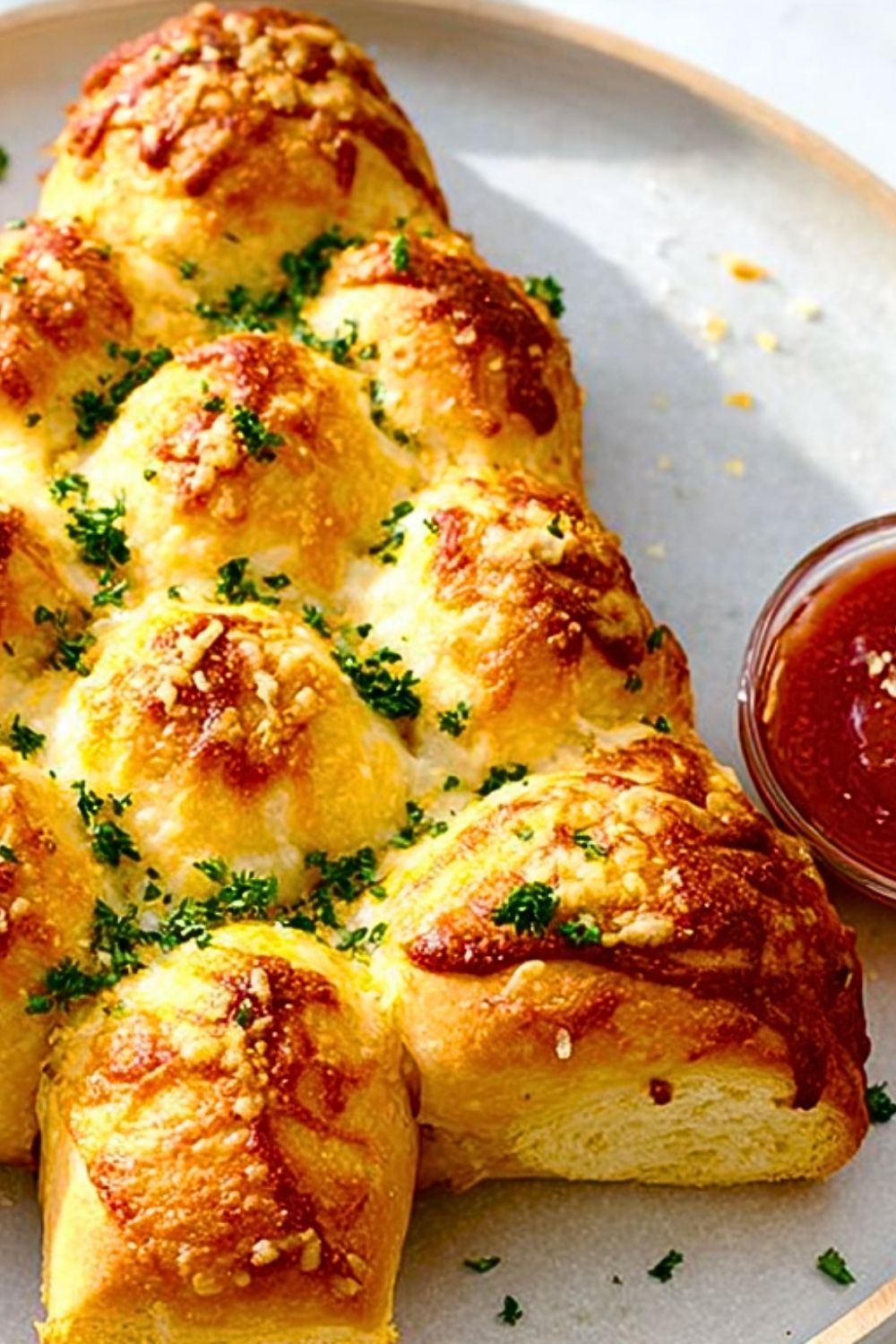 Remove the tree from the oven and immediately brush with any remaining garlic butter. Sprinkle with grated parmesan and extra chopped parsley for a festive finish. Serve warm with a bowl of marinara or pizza sauce for dipping.