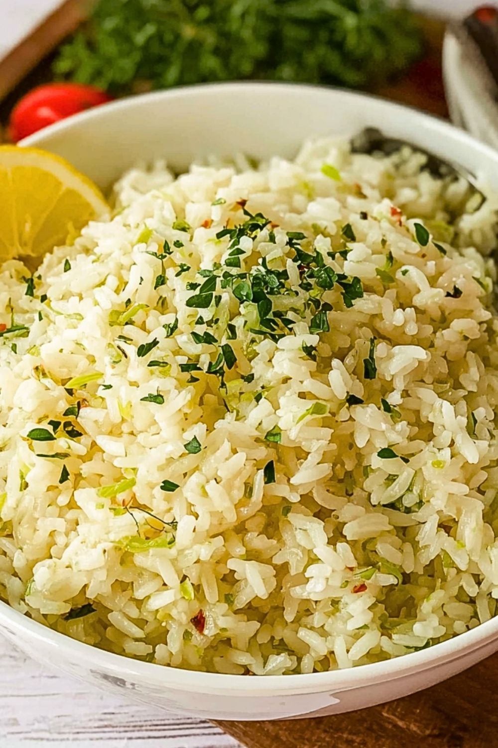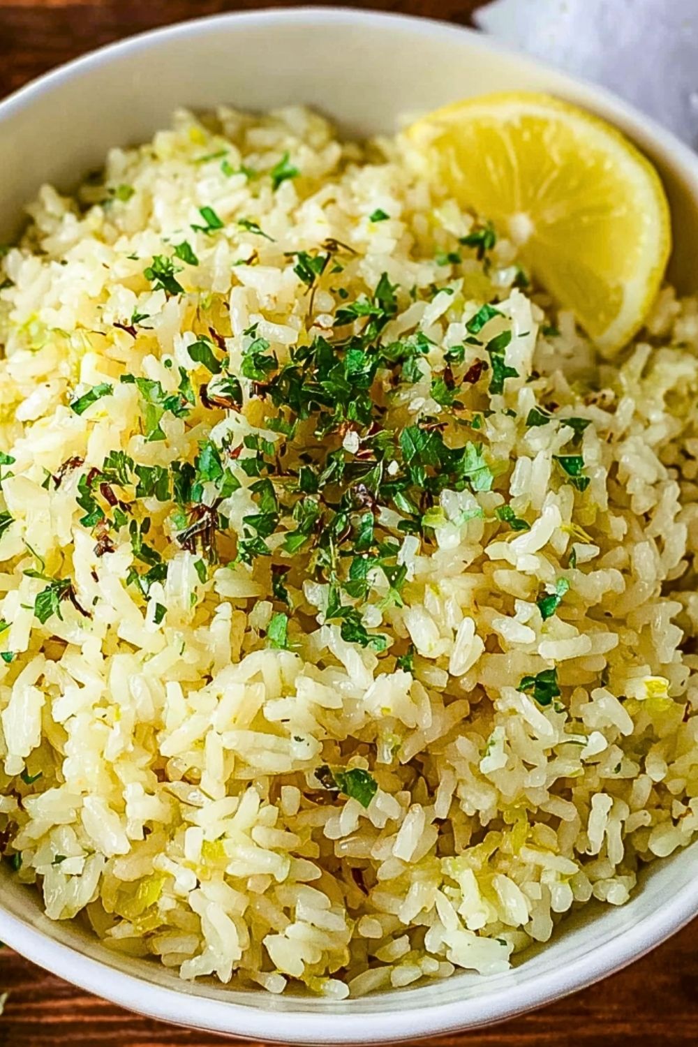 Uncover the pan and fluff the rice gently with a fork. Stir in chopped fresh parsley and adjust seasoning with extra lemon juice or salt if needed. Serve warm with additional parsley sprinkled on top.