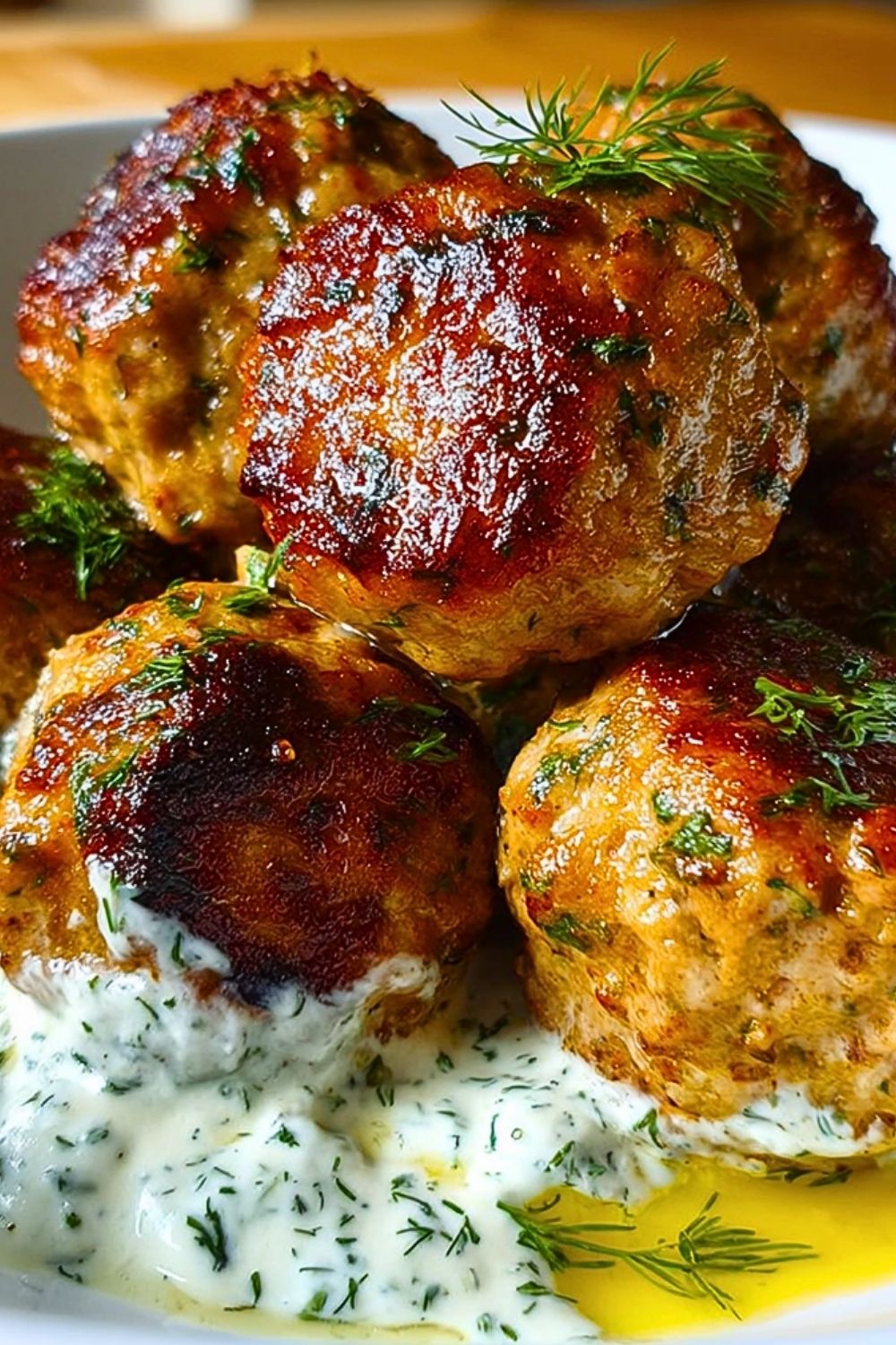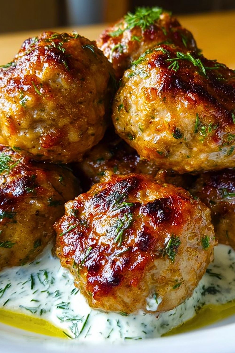 8. Serve meatballs hot, topped with the yogurt dill sauce and extra fresh dill.