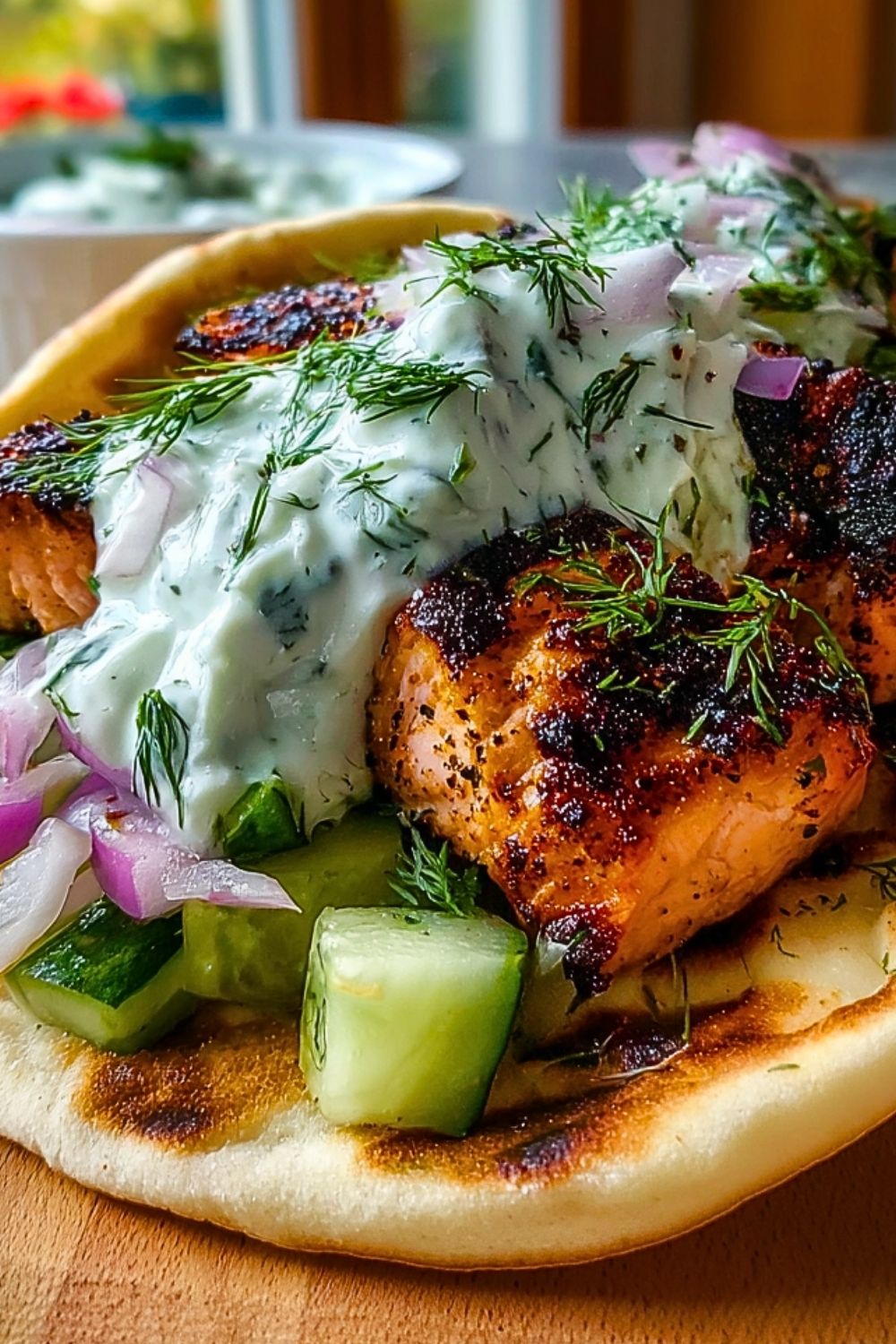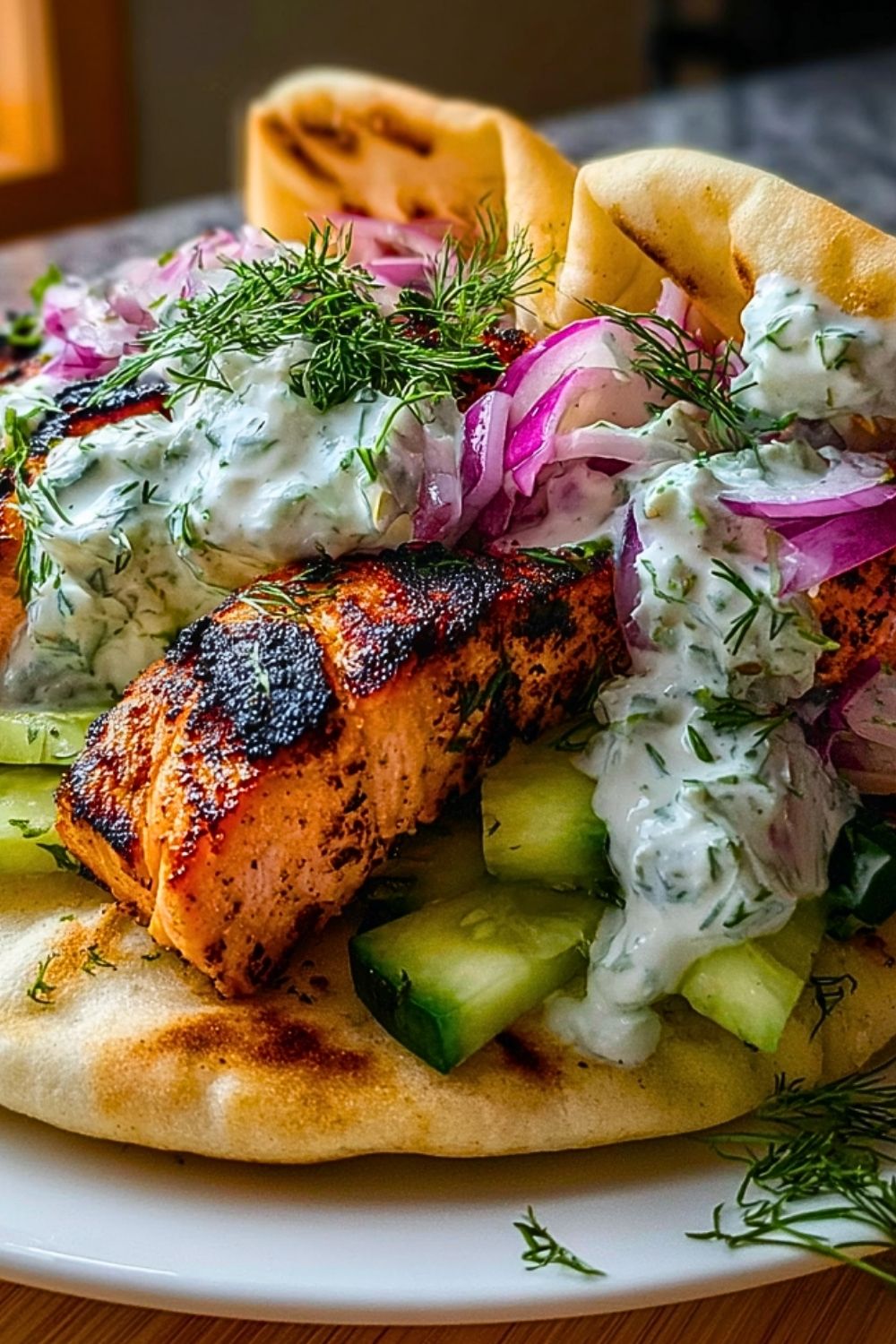 The salmon is marinated in a blend of olive oil, lemon juice, garlic, and spices, then grilled to perfection until slightly charred and smoky. Paired with a refreshing homemade dill yogurt sauce, crisp cucumbers, and red onions all wrapped in soft pita bread, it’s a flavor-packed, Mediterranean-inspired meal that feels both indulgent and nourishing.