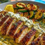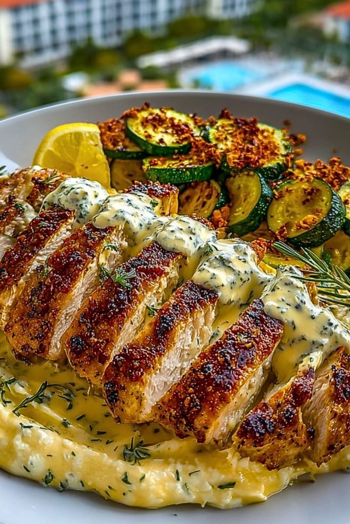 Slice the rested chicken breasts and lay them over a bed of roasted zucchini. Drizzle generously with the lemon dill Alfredo sauce. Add dollops or swipes of the whipped feta on the side or across the plate for extra creaminess and tang. Finish with fresh herbs or a pinch of red pepper flakes, if desired.