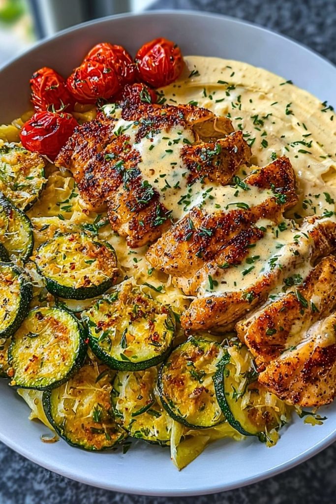7. Slice the rested chicken and layer over roasted zucchini. Spoon Alfredo sauce over the top.