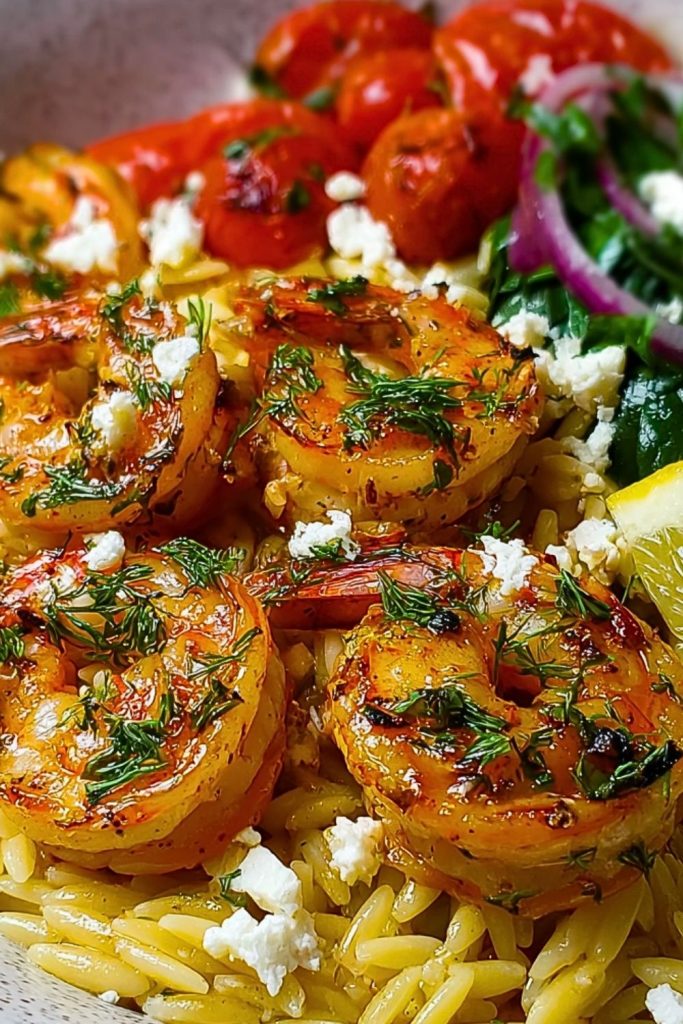 In serving bowls, spoon in the lemony orzo as the base. Top with roasted shrimp, burst cherry tomatoes, and sautéed spinach. Sprinkle generously with crumbled feta, more fresh dill, and thin lemon slices for garnish. Add red onion for an extra layer of flavor if you like.