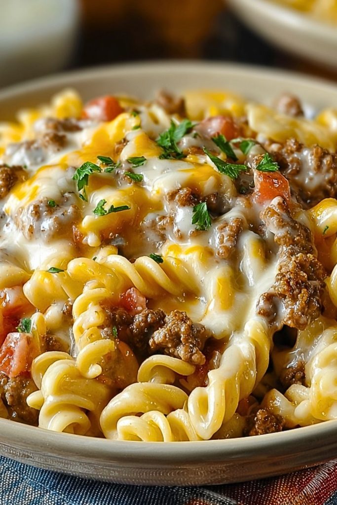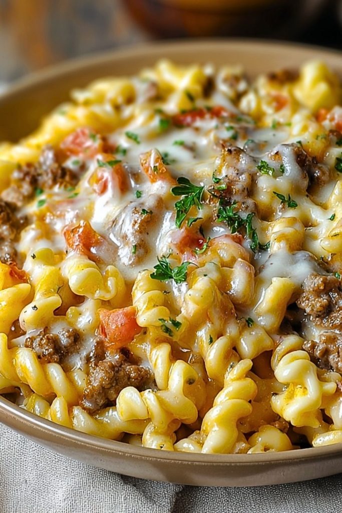 Keywords: cheeseburger pasta, easy dinner, alfredo pasta, ground beef pasta, comfort food