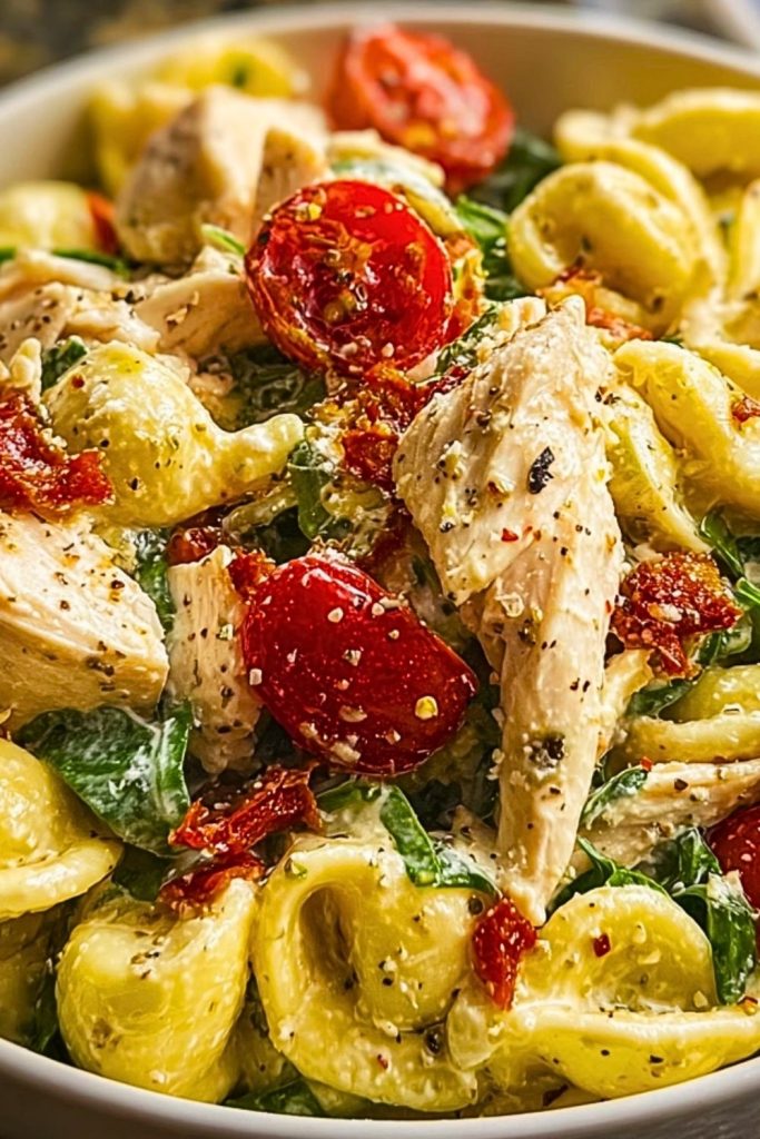 This pasta salad takes tender shredded chicken, cheese-filled tortellini, and fresh spinach, then tosses it all together with sun-dried tomatoes and a luxuriously creamy dressing. Whether you’re meal prepping for the week, bringing a dish to a potluck, or just looking for a way to elevate your lunch, this recipe brings warmth and flavor to the table with minimal effort.