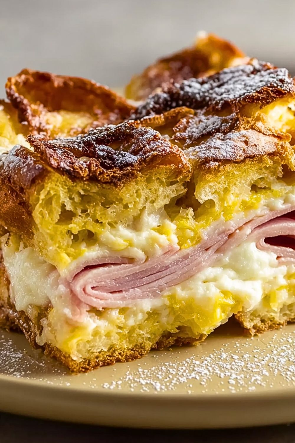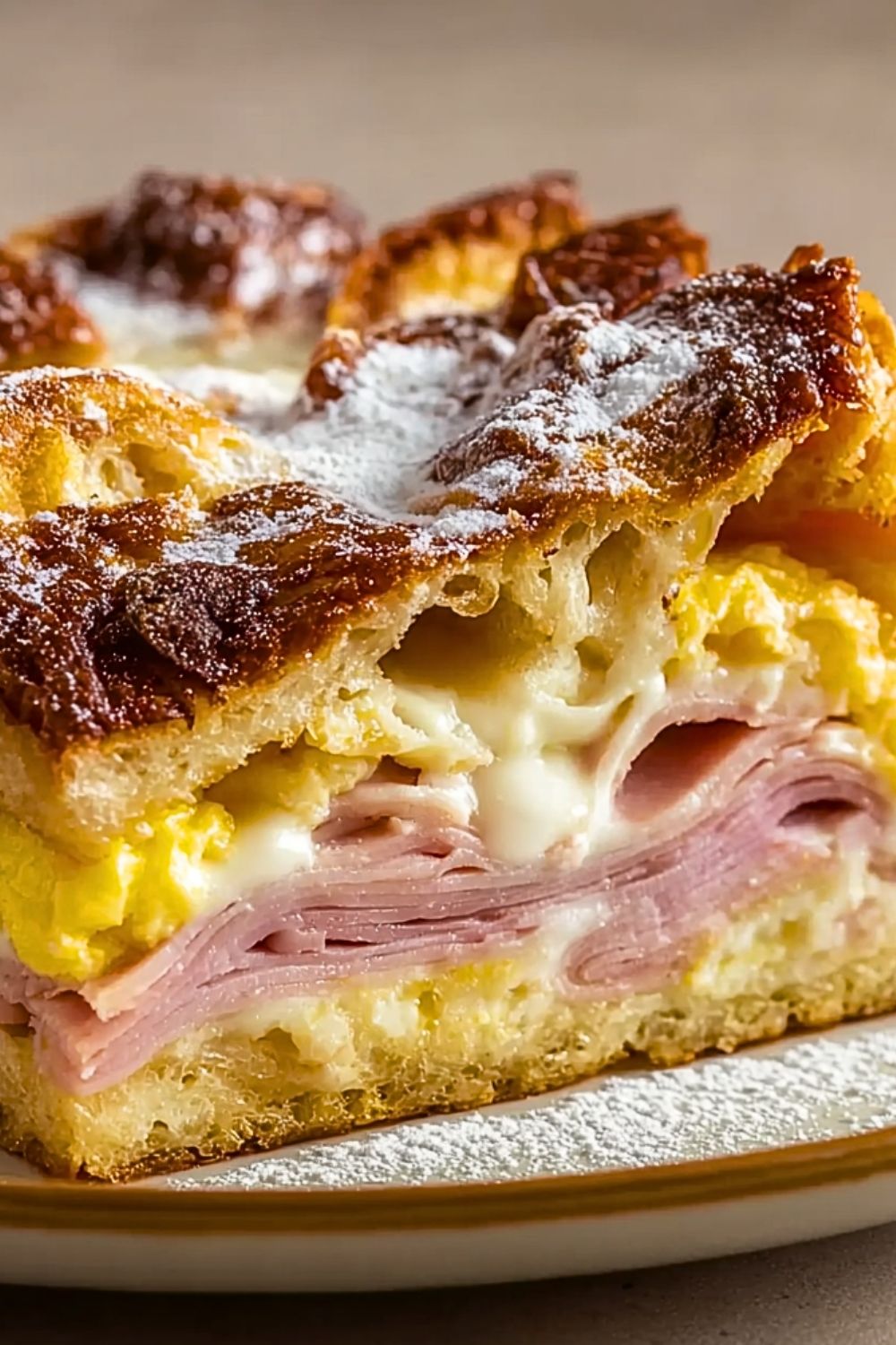 Let the casserole cool for 10 minutes before slicing. Dust generously with powdered sugar before serving. Optionally, serve with a small dollop of raspberry jam or a drizzle of maple syrup for that classic Monte Cristo flavor contrast.