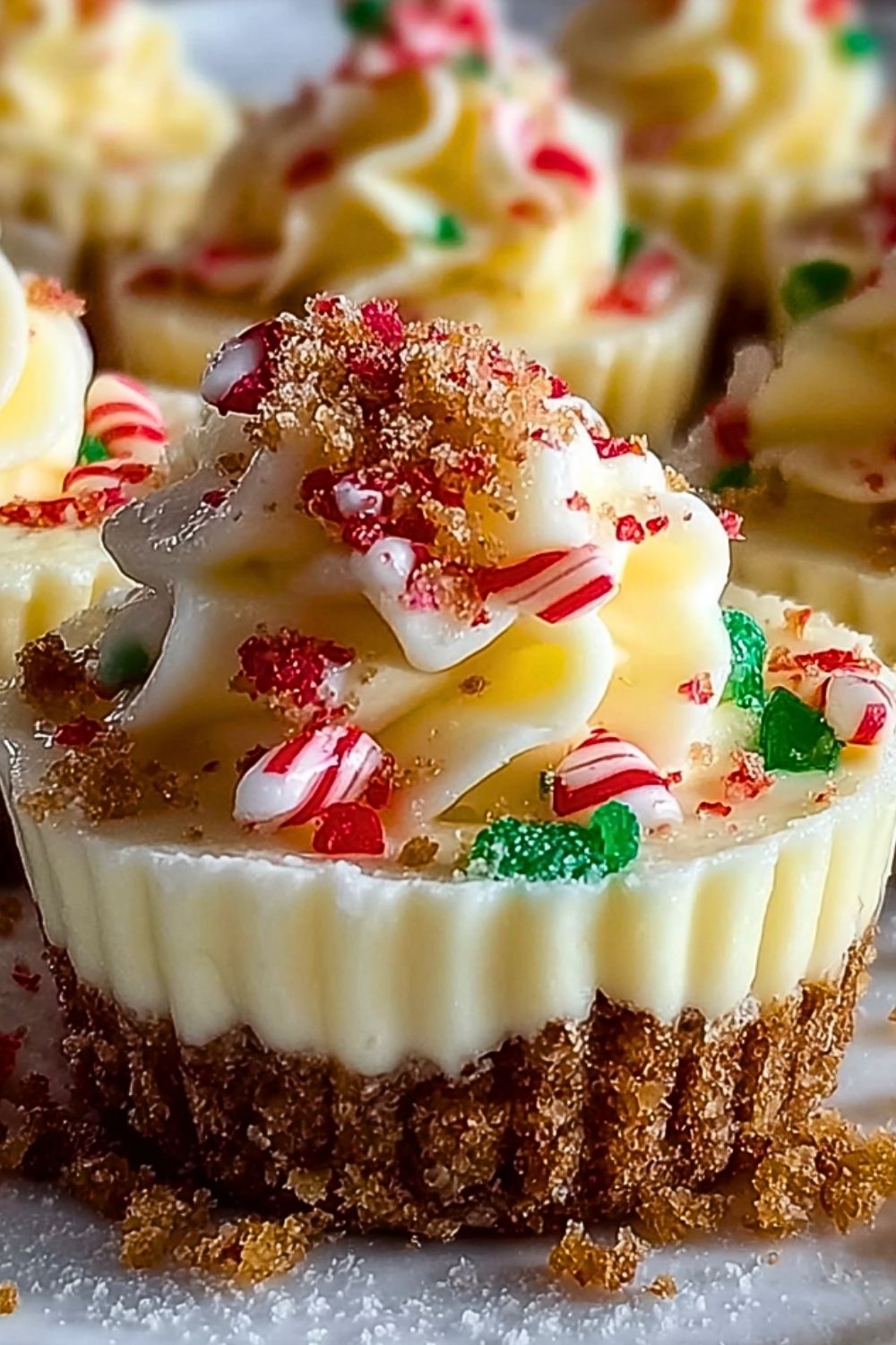 Once the cheesecakes are set, top them with swirls of whipped cream, crushed peppermint candies, and red and green holiday sprinkles. You can also drizzle them with white chocolate or dust with powdered sugar for an extra festive touch. Keep refrigerated until ready to serve.