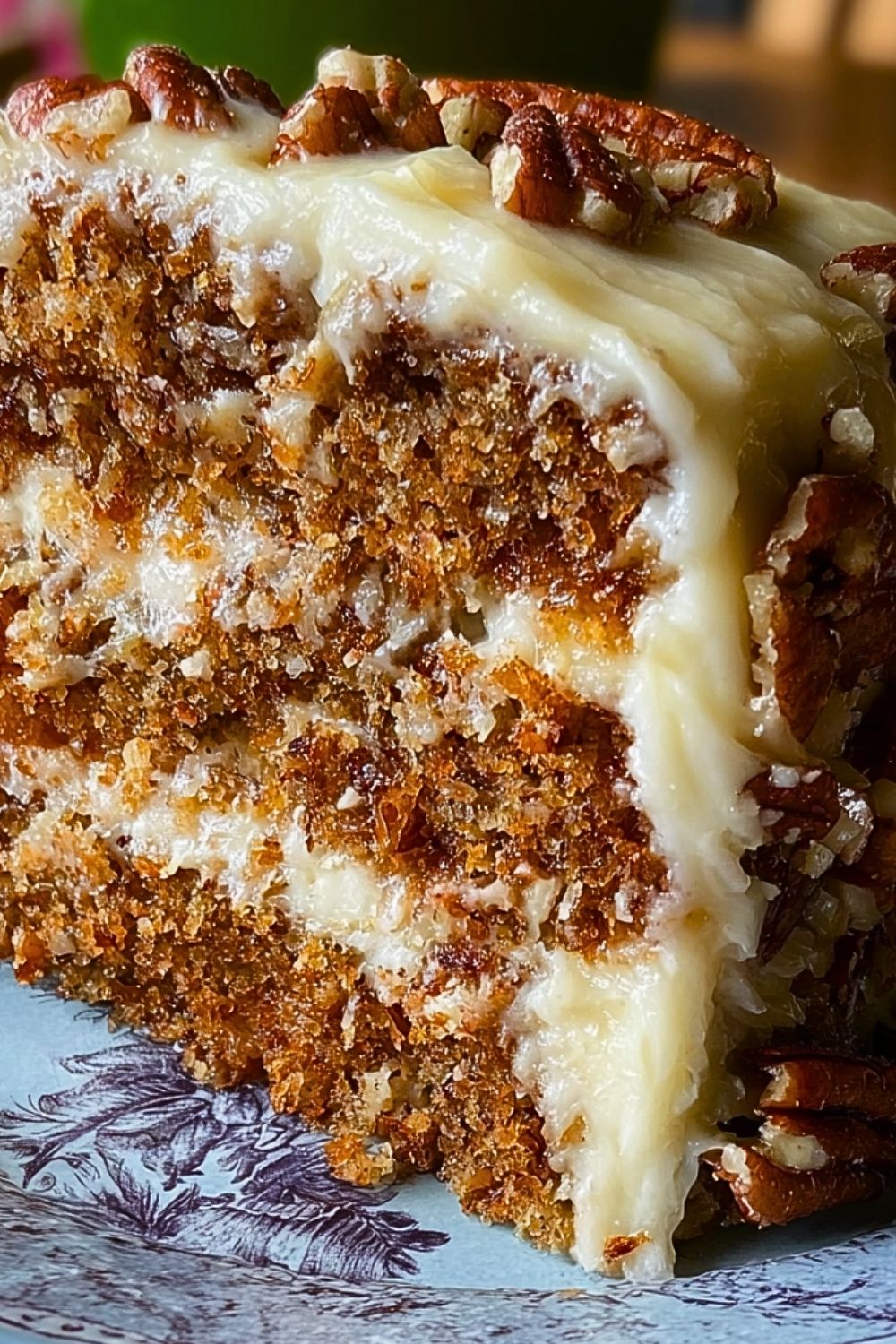 Sprinkle chopped pecans over the top or press them gently onto the sides for added texture. Chill the cake slightly before serving to help the frosting set beautifully.