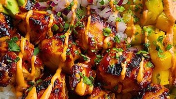 Grilled Maple Sriracha Chicken Bites with Coconut Rice & Mango Avocado Salsa Bowl with Chili Mayo