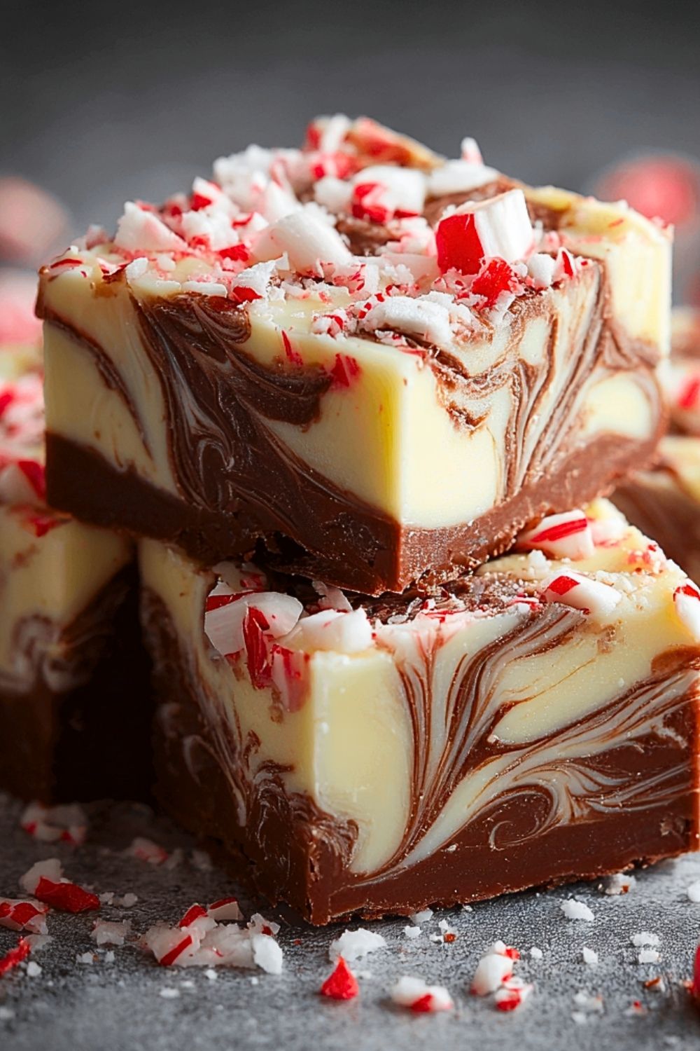 Use high-quality chocolate for the best flavor—bittersweet or semi-sweet for the base, and pure white chocolate for the swirl. Crush your peppermint candies just before using them to keep them crisp. When swirling, act quickly while both chocolates are still warm for the best marbled effect. Don’t overmix the layers; a few elegant swirls create the most visually appealing design. And remember: patience is key—let the fudge set fully before cutting.