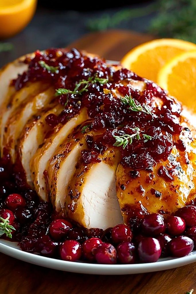 5. Transfer the sliced turkey to a serving platter. Spoon additional cranberry glaze over the top and garnish with fresh thyme and orange slices for an eye-catching finish. Serve warm with your favorite sides like mashed potatoes, roasted vegetables, or stuffing.