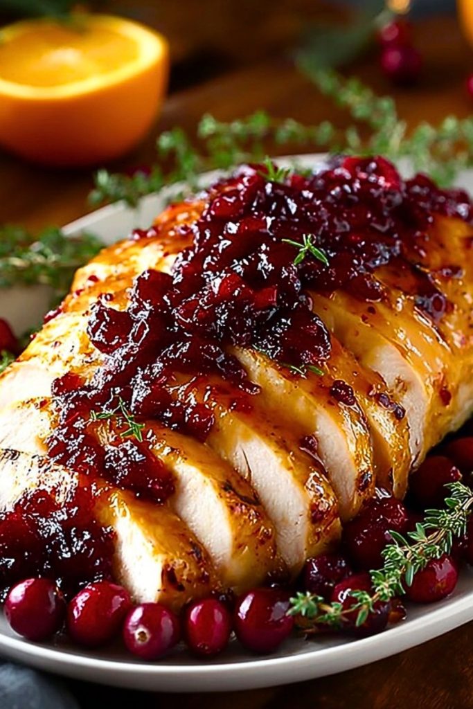 The glossy cranberry glaze caramelizes beautifully over the turkey skin, adding a sticky, flavorful finish that pairs effortlessly with the mild, juicy white meat. The sauce is made from real cranberries, fresh orange juice, zest, and a touch of sweetness, giving it depth and brightness. Whether you’re cooking for a small gathering or want something festive without roasting a whole bird, this dish hits the perfect balance of elegance and simplicity.