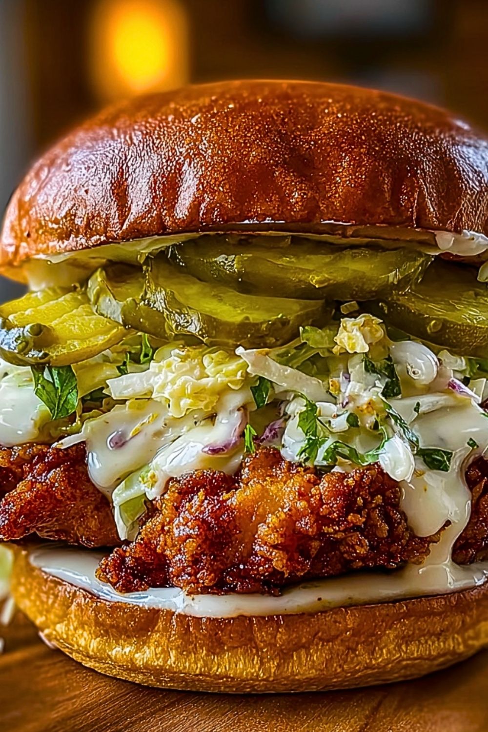 Spread ranch dressing or spicy mayo on the bottom bun. Add a generous layer of slaw, top with a piece of crispy fried chicken, add pickle slices, sprinkle with chopped parsley if using, and crown with the top bun. Serve hot and enjoy immediately for best texture and flavor.