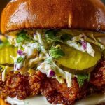 Marinating the chicken in pickle brine isn’t just a fun twist—it’s the key to both tenderness and flavor. Don’t skip the cornstarch in the dredge; it’s what gives the crust that extra crunch. For a bolder bite, go for spicy pickles and add a dash of cayenne in both the brine and the flour mix. The slaw offers a cool, creamy contrast that balances the heat and richness of the fried chicken. Want to switch things up? Swap out ranch for chipotle mayo or honey mustard for a unique flavor spin.