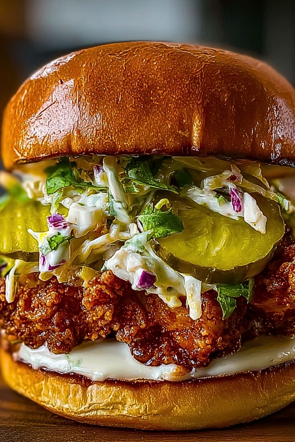 Use boneless, skinless chicken thighs for their flavor and juiciness. Let the chicken marinate in the pickle brine for at least 4 hours, or overnight for deeper flavor. Pat the chicken dry before dredging to help the coating stick better and crisp up during frying. Don’t overcrowd the frying pan—fry in batches to keep the oil temperature steady. For a crisp slaw, mix just before serving, and toast the brioche buns until they’re slightly crunchy on the edges to hold up against the juicy filling.