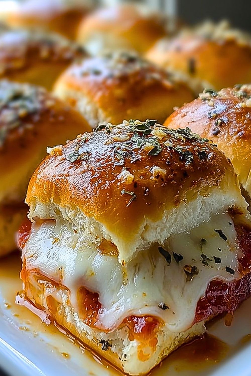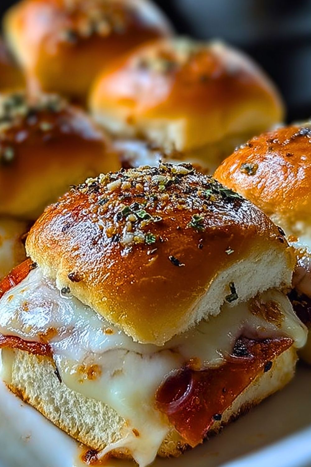 Place the top half of the buns back over the fillings. In a small bowl, mix melted butter, garlic powder, and Italian seasoning. Brush this mixture generously over the top of the buns. Sprinkle with grated Parmesan if using.