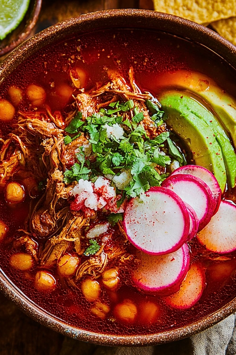 Ladle the hot pozole into bowls. Top each serving with radishes, avocado, a squeeze of lime, and cilantro. Serve with tostadas or tortilla chips on the side for some crunch.