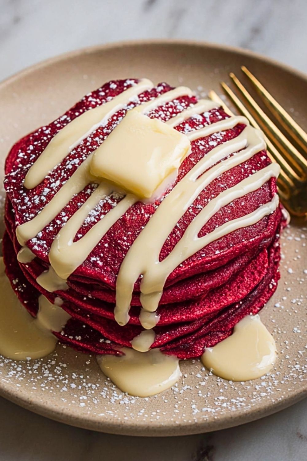 Red Velvet Pancakes are a breakfast showstopper that brings the essence of dessert to your morning plate. From their vibrant color to the creamy glaze, they strike a balance between indulgent and comforting. Whether it’s for a romantic Valentine’s surprise or just a luxurious weekend treat, this recipe is a keeper for anyone who loves creative breakfast ideas with a twist.