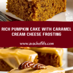 Keywords: pumpkin cake, fall dessert, caramel cream cheese frosting, easy recipe, quick dessert
