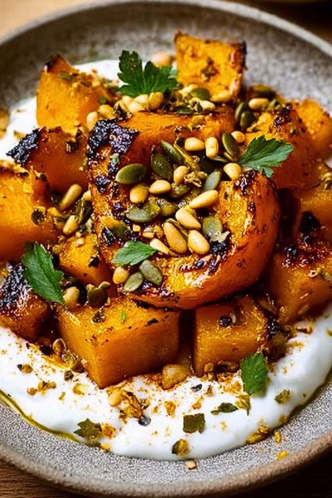Golden, caramelized cubes of roasted pumpkin meet their perfect match with a tangy, velvety lemon yogurt and the delicate crunch of toasted pine nuts. This dish is more than a side — it’s a seasonal celebration. Each bite brings together sweet roasted edges, cool creaminess, and nutty depth, all tied together with a drizzle of olive oil and a sprinkle of freshly cracked pepper.