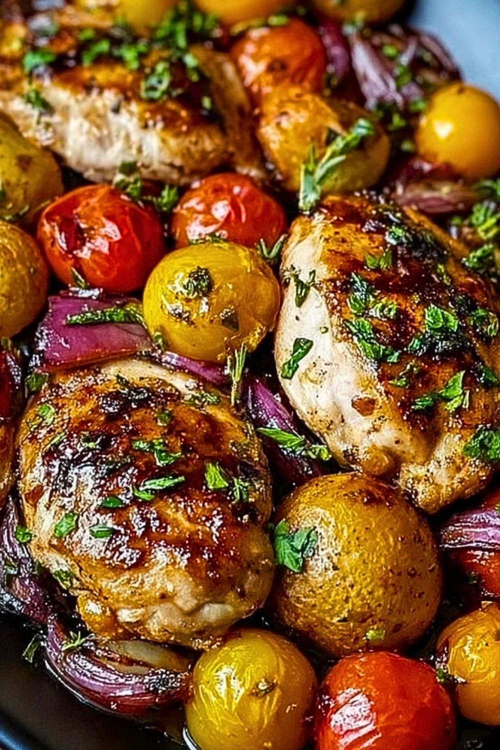 Dinner doesn’t get any easier—or tastier—than this Sheet Pan Balsamic Chicken and Veggies. Juicy, marinated chicken breasts roast alongside blistered cherry tomatoes and sweet caramelized onions, all glazed with a garlicky balsamic reduction. It’s a quick dinner, easy recipe, and healthy meal idea perfect for busy weeknights, meal prep, or dinner ideas that don’t require multiple pans. Bursting with flavor, colorful veggies, and minimal cleanup, this is your new go-to dinner solution.