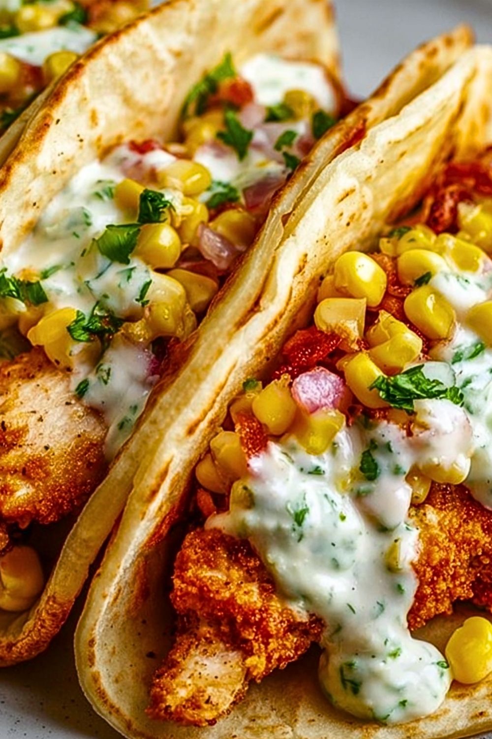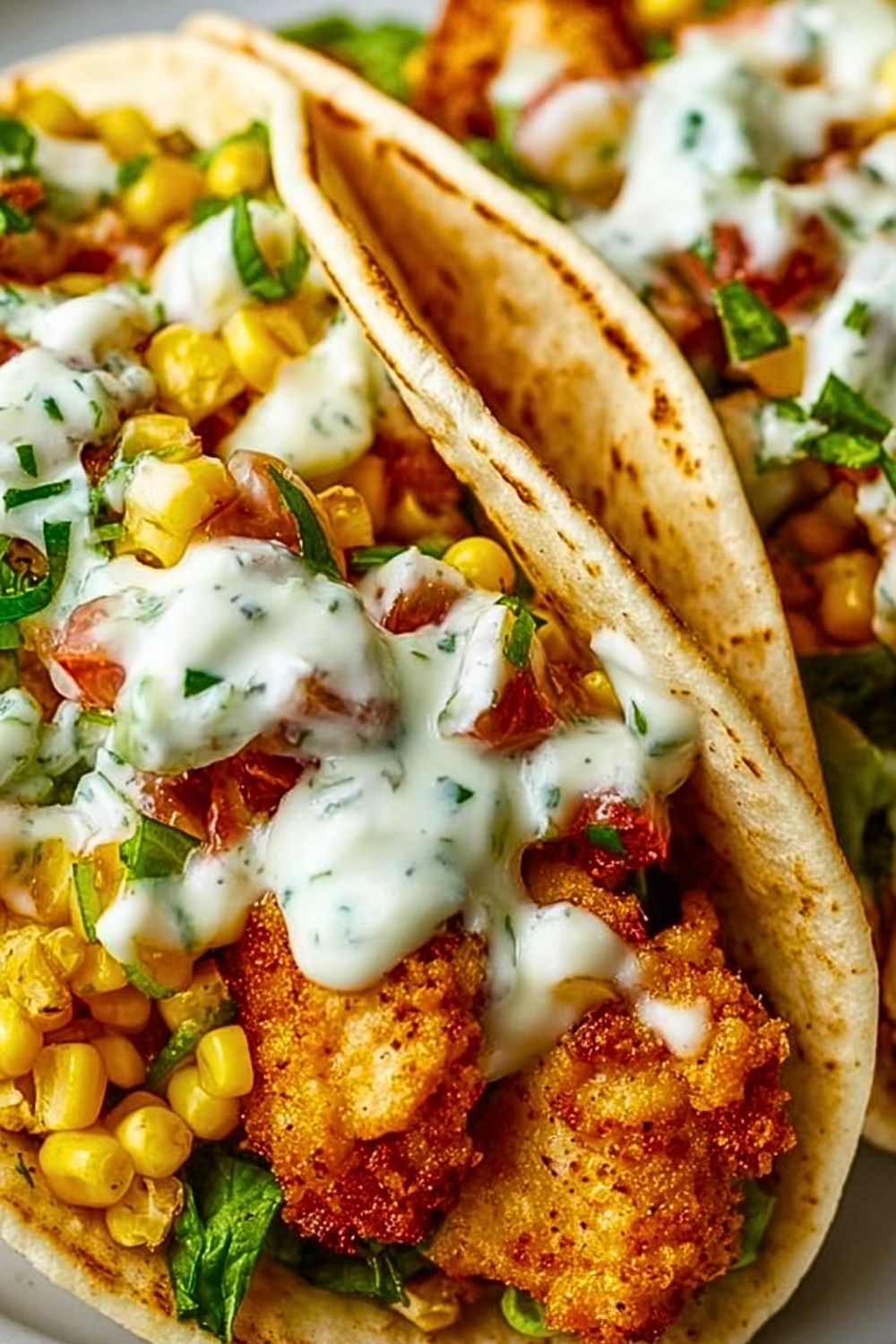 Place a piece or two of crispy chicken on each warm pita. Top with corn, bacon, chopped herbs, and a generous drizzle of herby ranch. Add any extra toppings you like.