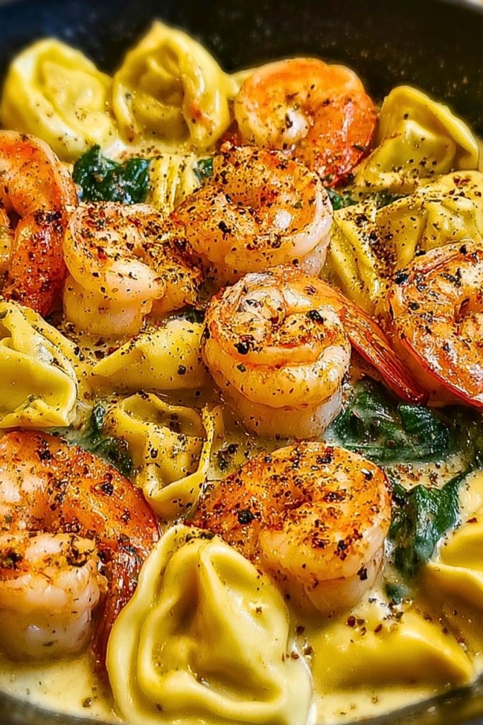 Add the cooked tortellini to the sauce and stir to coat. If the sauce is too thick, add a splash of the reserved pasta water. Return the shrimp to the skillet and gently mix.
