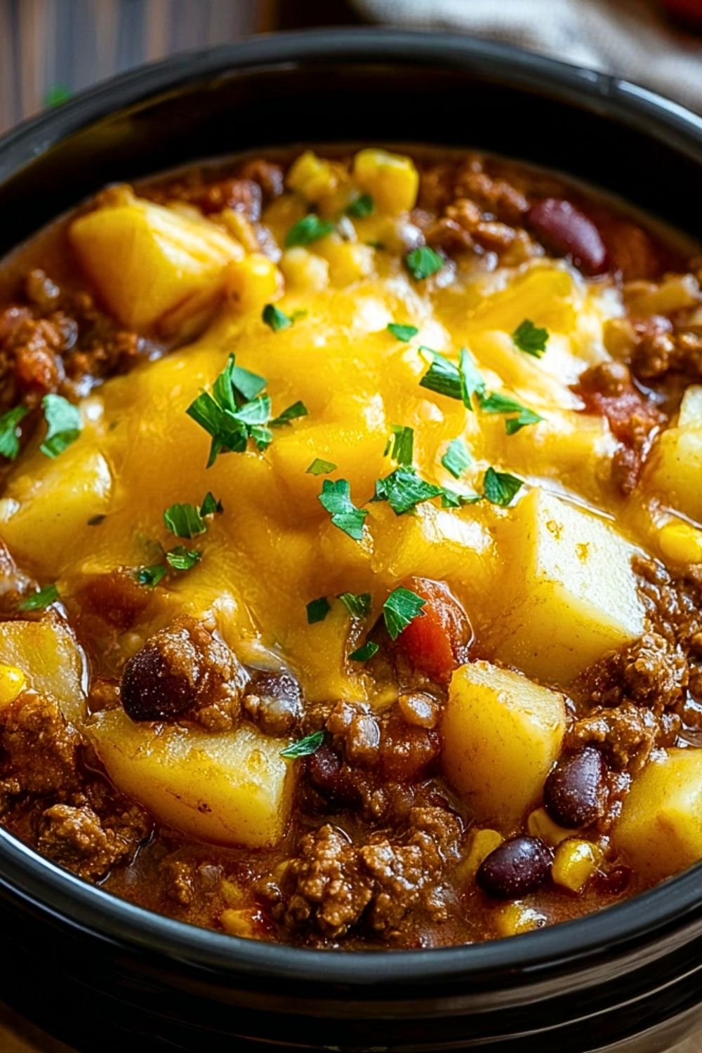 In your 6-quart slow cooker, add the browned ground beef and onions as the first layer. Next, add the cubed potatoes, followed by the beans, corn, and diced tomatoes (with their juice). Do not stir at this point to maintain even cooking.