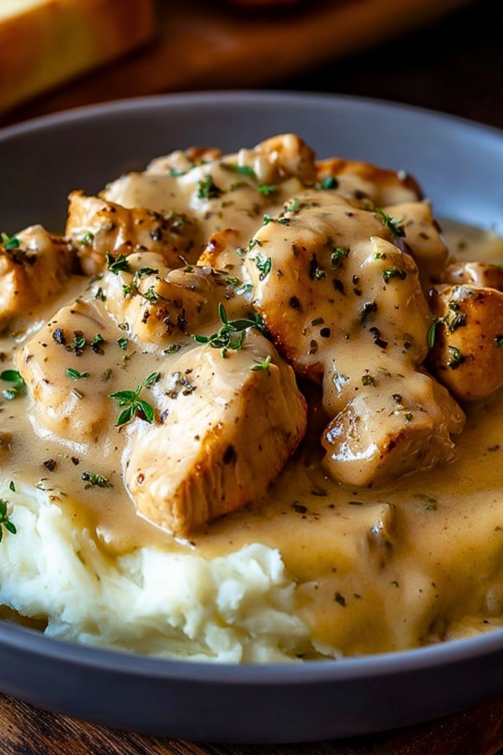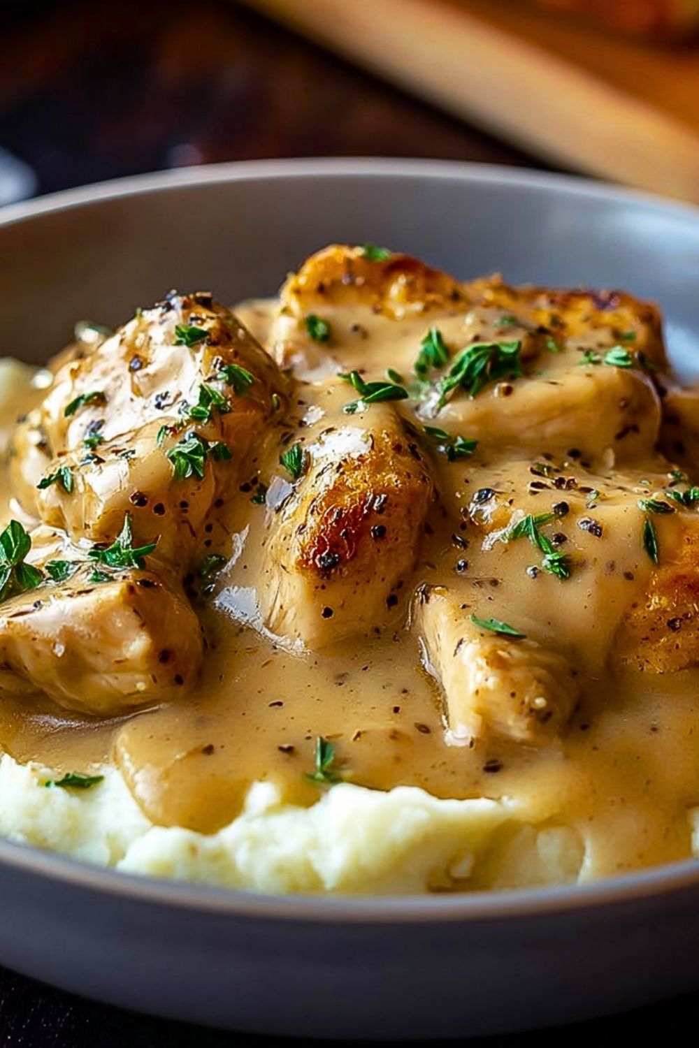 Spoon the creamy chicken and gravy generously over mashed potatoes, white rice, or egg noodles. Top with freshly chopped parsley or a dash of black pepper if desired.