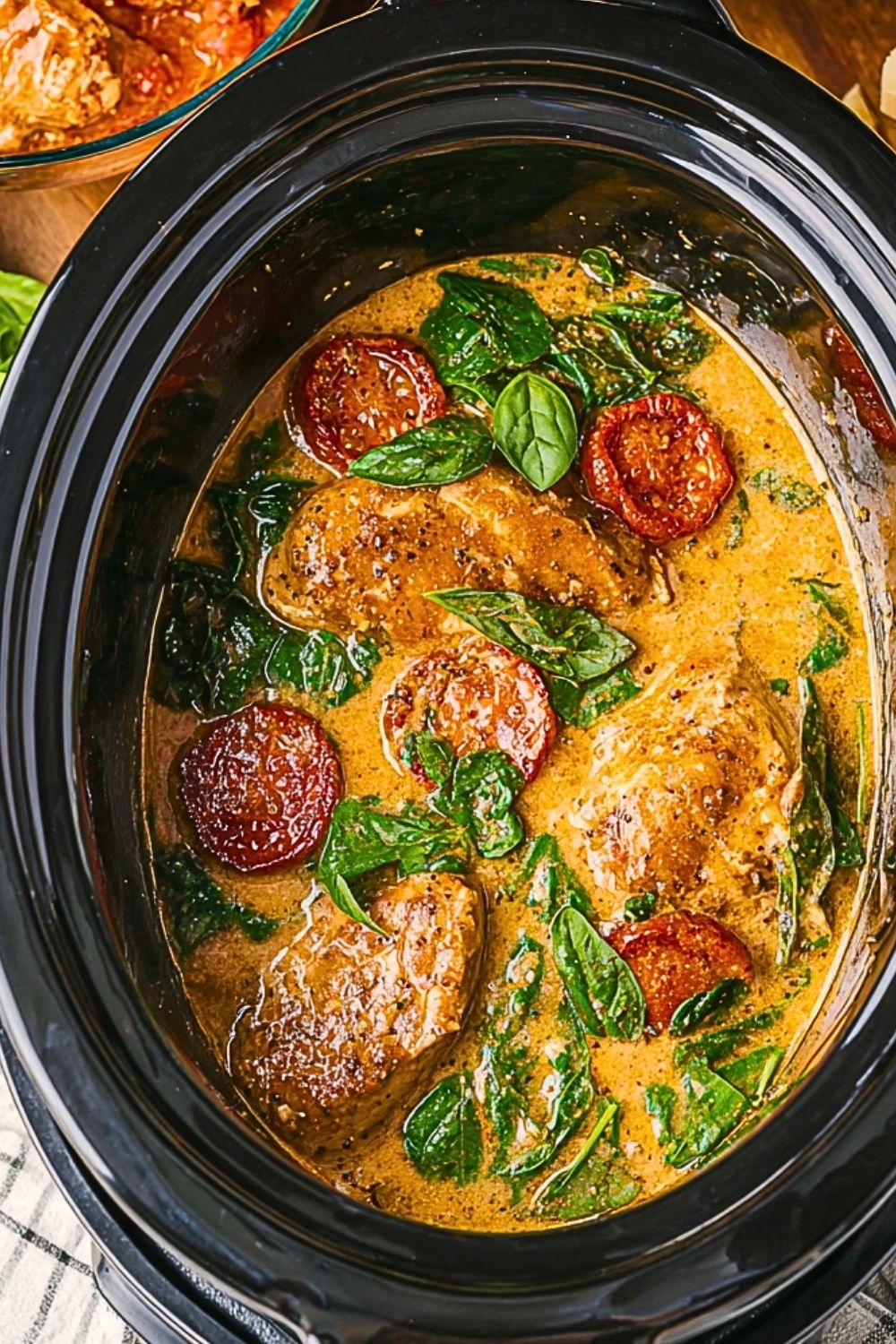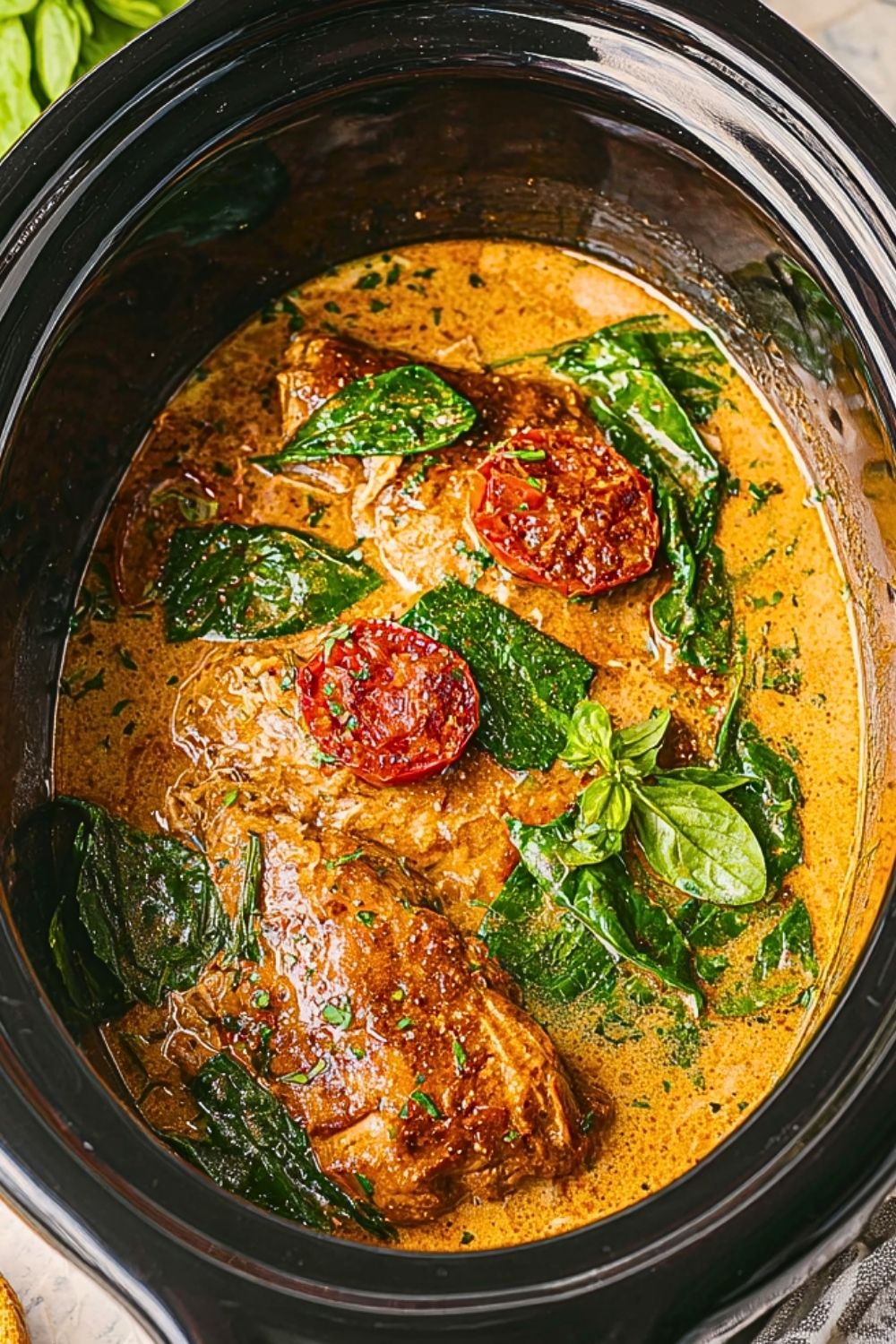 To create a rich and satisfying slow cooker dinner inspired by the creamy Tuscan-style dish shown, gather the following ingredients: