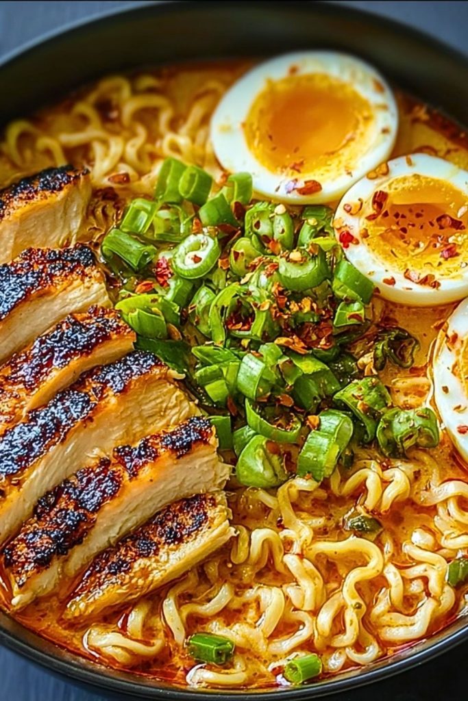 Craving a warm, satisfying meal that brings heat and comfort in one spoonful? This Spicy & Creamy Chicken Ramen is exactly what your weeknight dinner needs. With rich, flavorful broth made from miso, coconut milk, and chili oil, this ramen wraps around tender noodles, juicy grilled chicken, and soft-boiled eggs for the ultimate indulgence. Whether you’re looking for quick dinner ideas, easy comfort food, or a bold, cozy bowl to warm you up, this dish delivers. It’s ideal for foodies craving restaurant-quality flavor from the comfort of home—no need for takeout. Perfect for those looking for easy recipes, dinner ideas, or healthy-ish food inspiration.