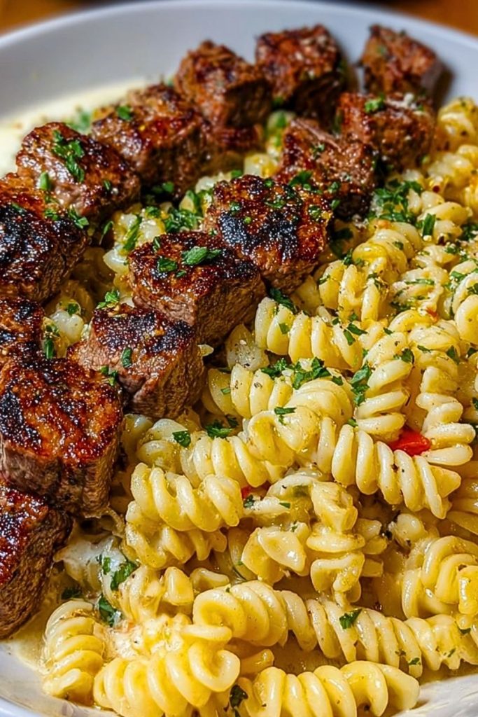 Steak Bites and Cheesy Rotini in Garlic Parmesan Sauce